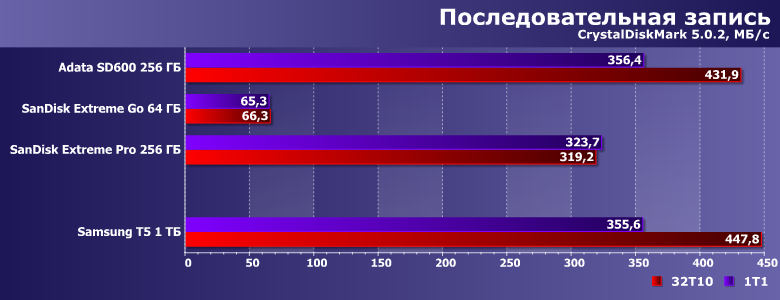 Скорость записи больших объемов информации у всех испытуемых намного ниже, чем демонстрируют низкоуровневые утилиты. Впрочем, более 200 МБ/с, которые обеспечивает Т5, вряд ли можно считать проблемой — для начала нужно найти еще большое количество данных, не забывая о том, что «искать» придется тоже на быстром накопителе (винчестер, например, не подойдет — особенно установленный не локально, а в NAS). Кроме того, тут уже есть определенные тонкости в работе с накопителями самой операционной системы, о чем мы поговорим более подробно в одном из ближайших материалов.