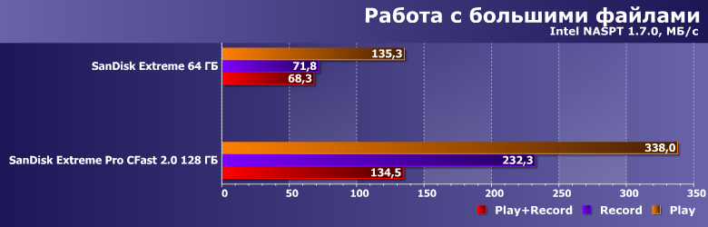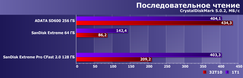 Скорости получились более низкими, чем в бенчмарках низкого уровня, однако все равно очевидно, что на 200-300 МБ/с рассчитывать можно точно — даже в не самых удобных режимах. Сменных носителей же с такими скоростями на рынке буквально три типа, причем для SD UHS-II это фактически теоретический потолок. А «классический» CompactFlash и в теории на такое был неспособен.
