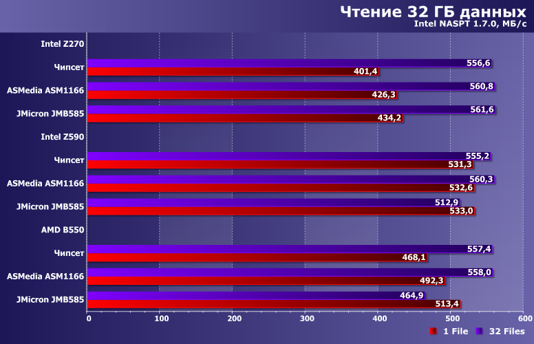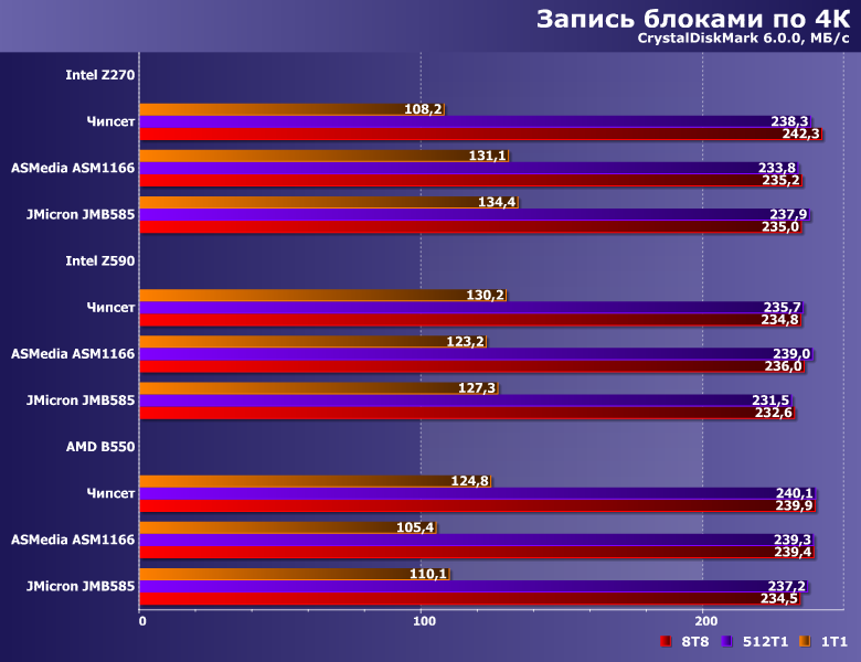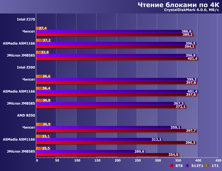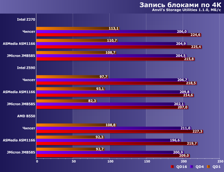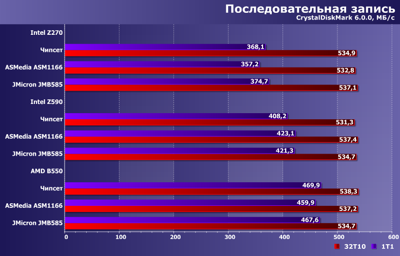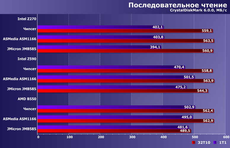 Казалось бы, SATA600 интерфейс старый — и ничего нового тут не придумаешь. Однако нашлось — и речь не только о чипсетных контроллерах. В частности, на новых платформах практически повсеместно выросла скорость однопоточного чтения. Многопоточное же традиционно упирается в пропускную способность интерфейса. Во всех случаях, кроме JMB585 на АМ4 — тут явно есть какие-то нюансы совместимости. Но окончательный вердикт будет выносить, когда с другими результатами ознакомимся.