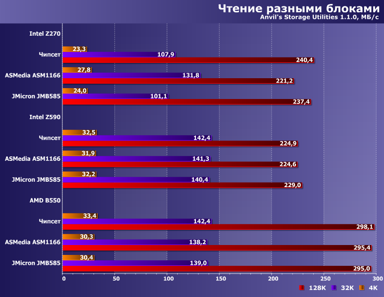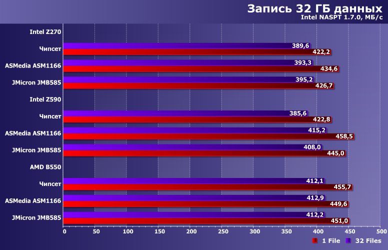Однопоточная запись подросла тоже — но на AMD AM4 сильнее. Впрочем, понятно, что мало кто будет выбирать платформу по скорости чипсетного контроллера (причем в низкоуровневых бенчмарках), так что главный вердикт — хуже при апгрейде не станет, а современные дискретные контроллеры в первом приближении не хуже современных же чипсетных.