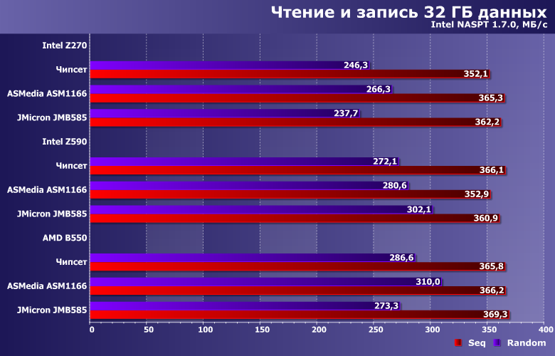 Но главное тут, конечно, сравнение чипсетов. И волноваться не о чем — на новой системе диски, по крайней мере, медленнее не станут. Вот дискретные контроллеры работают помедленнее — по-видимому, сказалось усложнение контроллера PCIe в «навороченных» современных чипсетах, но это как раз не слишком принципиально. В любом случае, единственным аутсайдером можно считать как раз старичка Z270 — так что на что его не меняй, а все равно хорошо. Чего и достаточно.