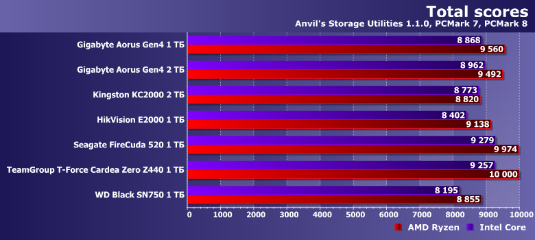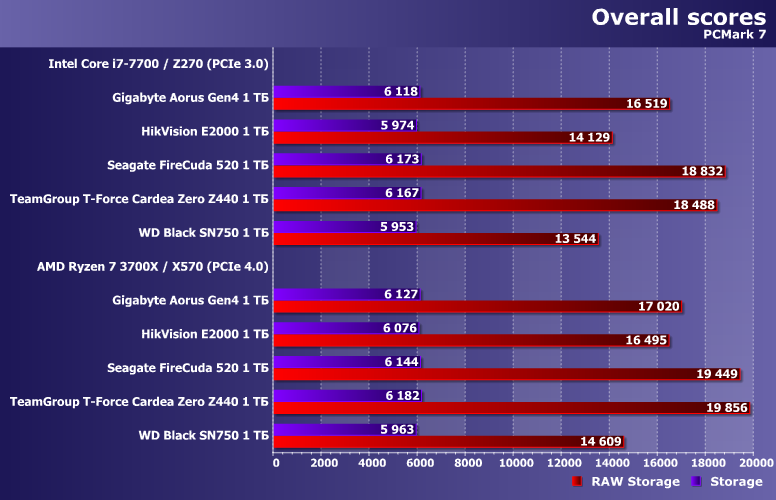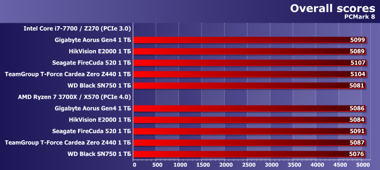 Тем более, что тут многое может быть связано не только с особенностями самих платформ, а с тем, как на них работает тестовое ПО. В частности, более старая версия PC Mark, напротив, отдает предпочтение Ryzen. Ну и главное — накопители на базе Phison E16 интересны не только поддержкой PCIe 4.0, а тем, что в любых условиях они оказываются одними из самых быстрых. Т. е. не только благодаря интерфейсу.