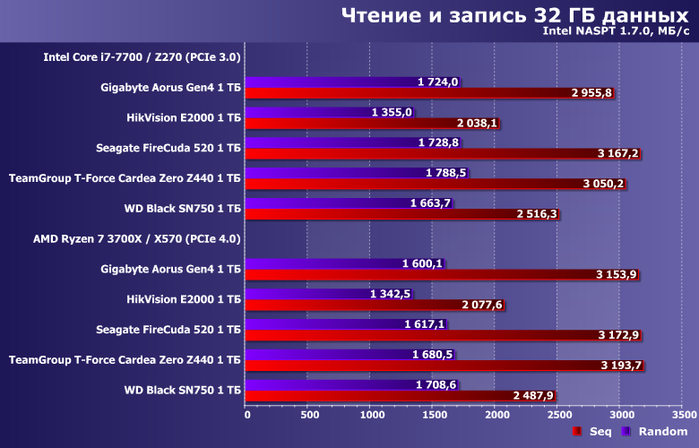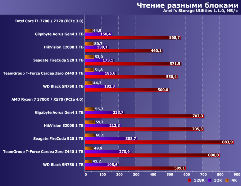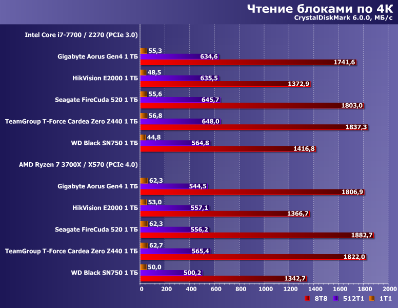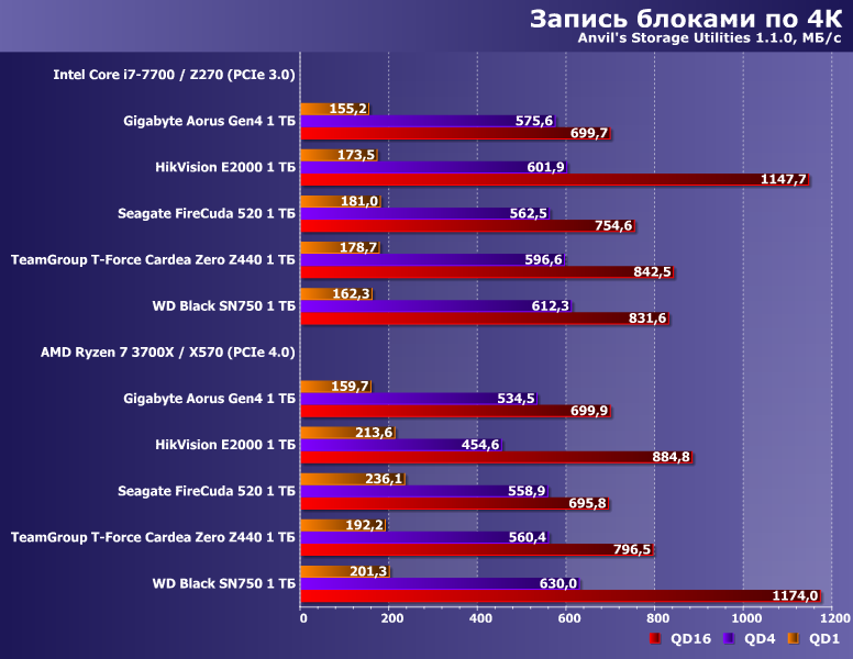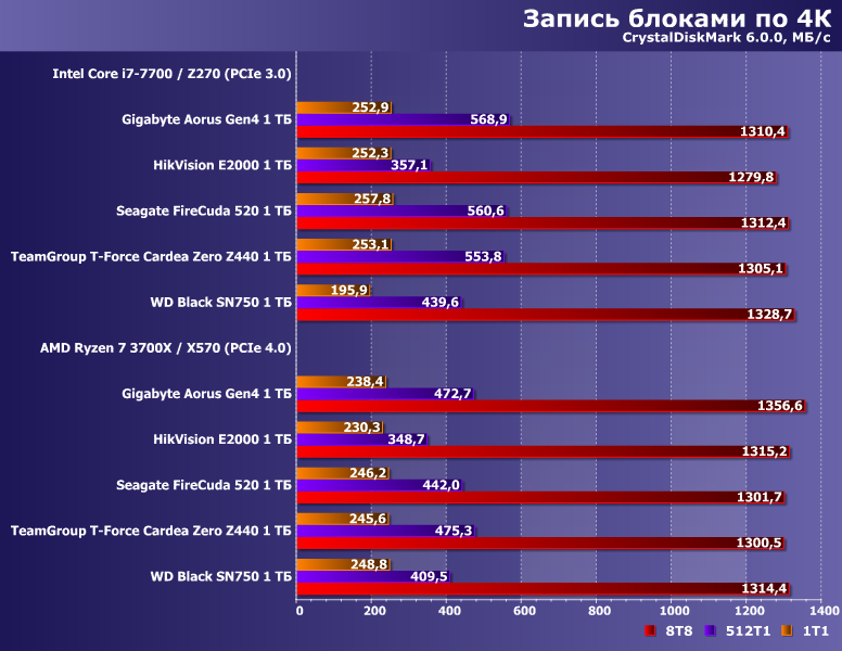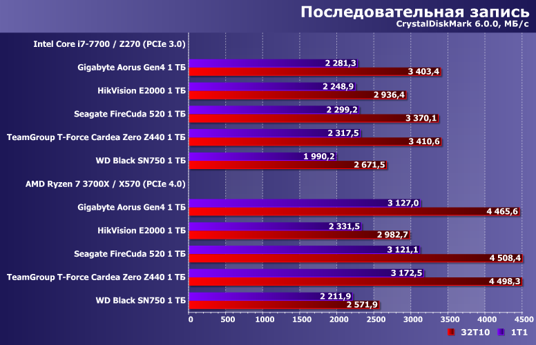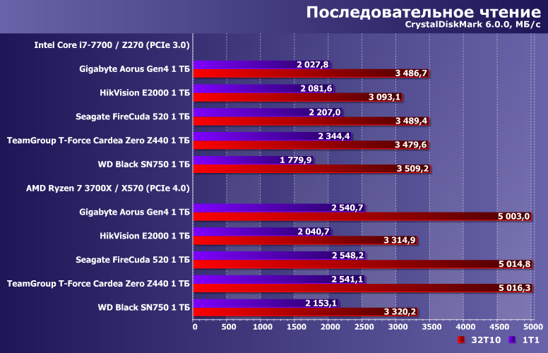 Однако тестировать накопители на базе Phison E16 только на «стандартном стенде» (Core i7-7700 на Z270) было бы, разумеется, идеологически неверным решением, поскольку главной их особенностью является поддержка интерфейса PCIe 4.0 x4. Поэтому ранее попадавшиеся нам терабайтники на этом контроллере (TeamGroup T-Force Cardea Zero Z440 и Gigabyte Aorus NVMe Gen4 SSD) мы тестировали также и на плате с чипсетом Х570 и процессоре AMD Ryzen 3700X. Кроме того, в такой конфигурации мы ранее протестировали WD Black SN750 1 ТБ с интерфейсом PCIe 3.0 x4, а сегодня добавим и результаты Hikvision Crius E2000 1 ТБ с таким же — но на Phison E12 и 64-слойной памяти Micron. Во всех случаях — при подключении непосредственно к процессорному контроллеру PCIe. Такое тестирование на двух платформах позволит точнее оценить — чего ждать от обновления интерфейса, а на чем больше сказывается сама платформа. В перспективе от этого можно будет и отказаться, но пока накопители с интерфейсом PCIe 4.0 интересны не только для работы в «родном» режиме, но и в «старых» платформах (коих на порядок больше), имеет смысл изучать их скоростные характеристики и так, и эдак.