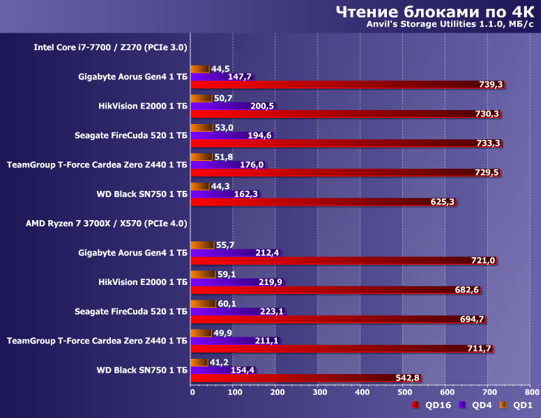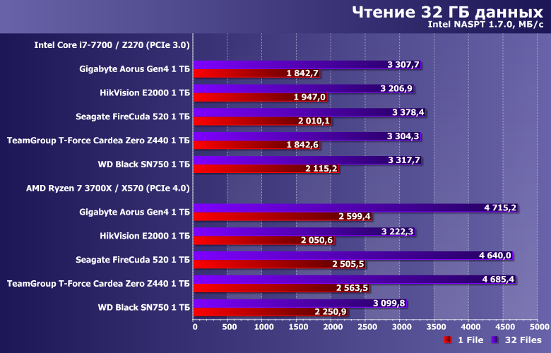 Задача на чтение, причем последовательное — в таких условиях крайне важен интерфейс. В т. ч. и тогда, когда производительность в него формально не «упирается», т. е. в однопоточном режиме — накопители на Е16 на Х570 выдают на четверть большую скорость, нежели в рамках старого PCIe. Правда вот абсолютные значения тут такие, что их не продашь — в отличие от многопоточного режима. Вот там все ближе к спецификациям — и результат такой, что на PCIe 3.0 x4 в принципе получить невозможно. Но слишком редко подобное происходит.