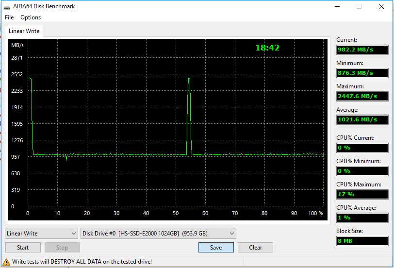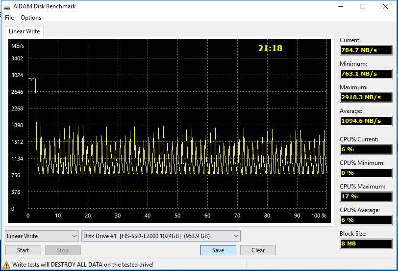 Проявляется даже при работе с накопителями, не поддерживающими новый интерфейс. Для примера мы взяли Hikvision Crius E2000 1 ТБ на Phison E12 и с уменьшенным размером SLC-буфера. На Core i7-7700 процесс занял менее 19 минут, причем большую часть времени график представлял собой ровнехонькую линию (один раз устройство успело «расчистить» кэш и подпрыгнуть до изначального значения).
