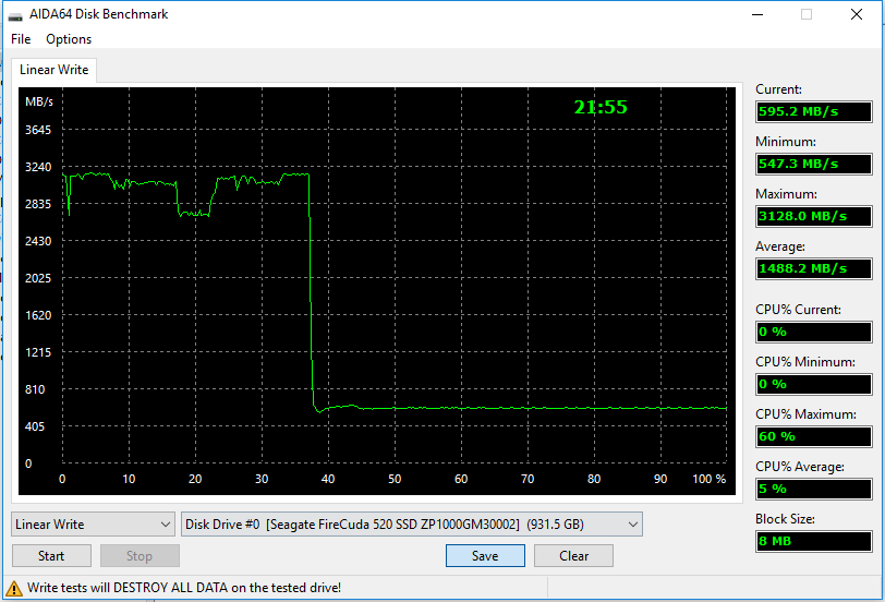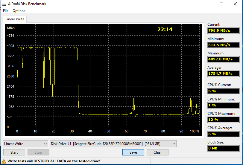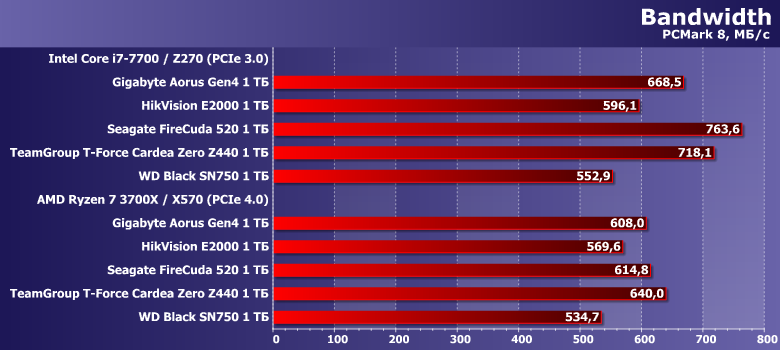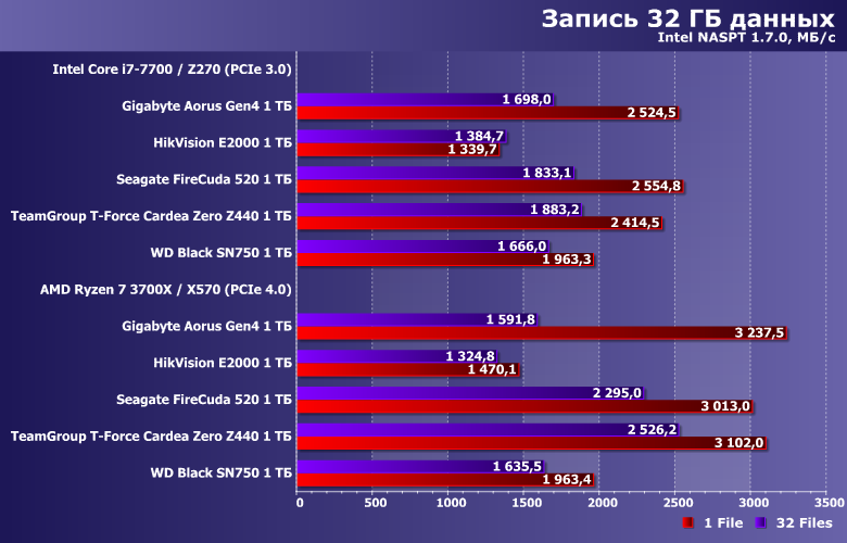 На Ryzen 7 3700X и плате на Х570 весь процесс занял уже больше 21 минуты. Максимальная скорость записи (в кэш) увеличилась, зато за пределами (маленького) SLC-буфера наблюдалась характерная пила. В итоге результирующая скорость оказывается процентов на 15 ниже, что уже заметно. В случае FireCuda 520 «потери» меньше — но они тоже есть. Даже несмотря на агрессивное кэширование, благодаря которому первые несколько сотен гигабайт записываются быстрее.