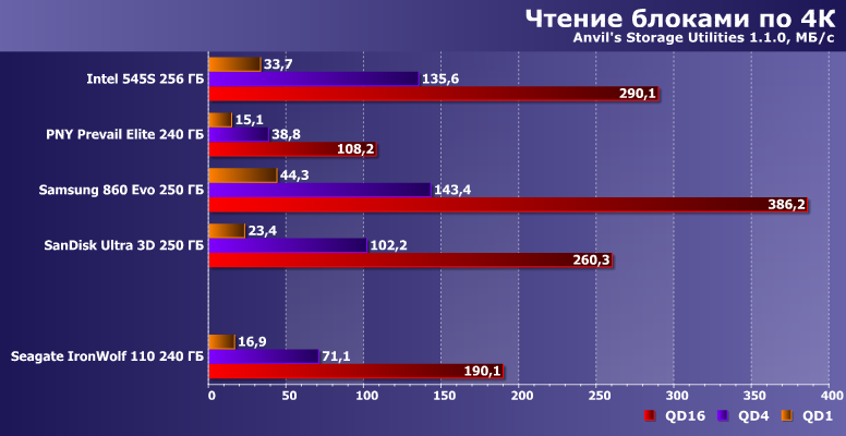 Чтение хорошо дается всем современным SSD практически на любых типах памяти, что тоже можно считать «побочным эффектом» технологии — специально этого добиваться не требуется. Примечательно, что «однопоточная» производительность за прошедшие годы даже несколько подросла, ну а при чтении в несколько потоков она уже давно «уперлась» в ограничения SATA600 и тут что-либо даже специально придумать сложно.