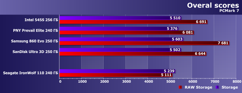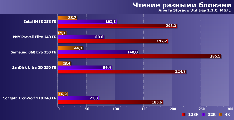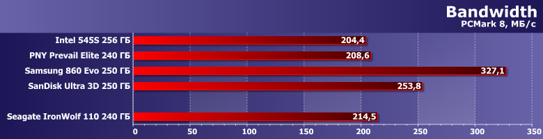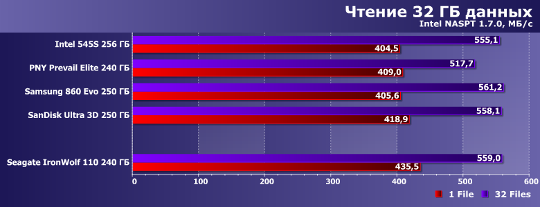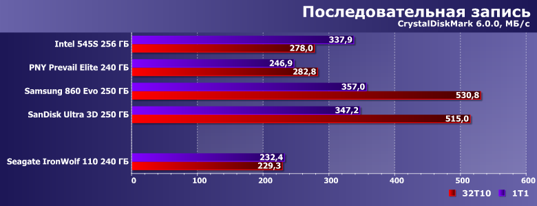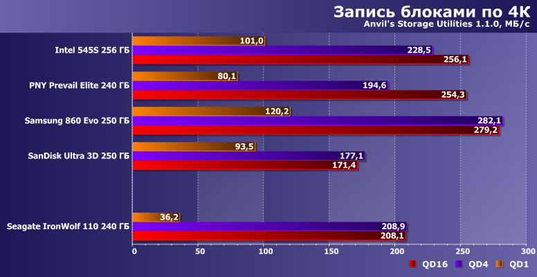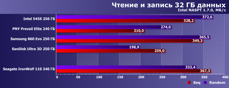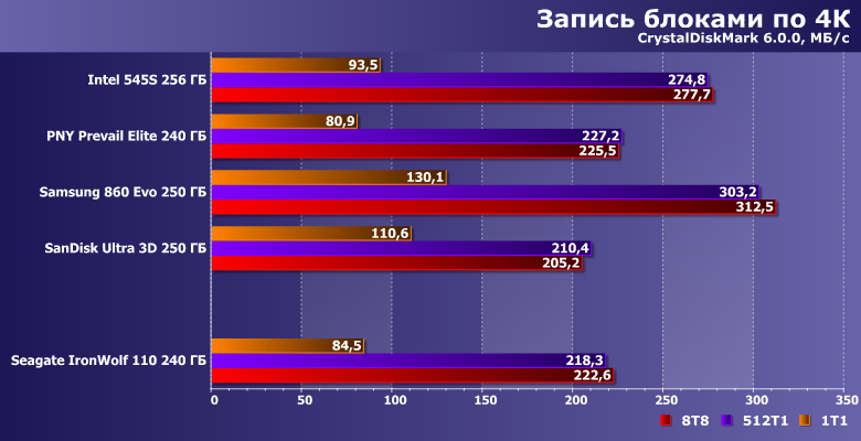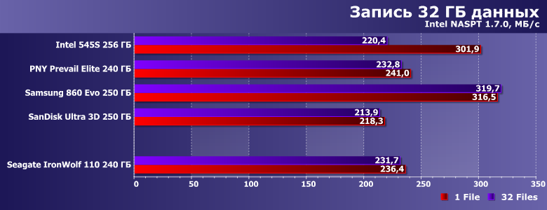 Вот скорость записи невысока — существенно ниже заявленных значений, хотя они для младшей модификации IronWolf 110 и без того хуже, чем для прочих. Но 345 МБ/с в многопоточном режиме компания «обещала», а мы получили на сотню меньше. В чем, впрочем, нет ничего криминального — для конкуренции с винчестерами даже в таких сценариях более чем достаточно. Но всегда хочется большего — тем более, что оно физически возможно, что наглядно демонстрируют нам SSD Samsung и SanDisk :) С другой стороны, если «писать нули», скорость может оказаться и выше заявленной (такова вообще особенность накопителей с DuraWrite), но изучение этого вопроса мы отложим до специального материала.