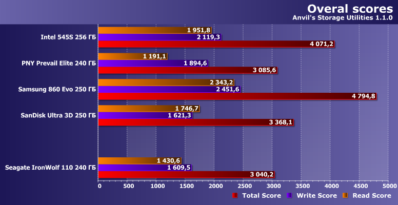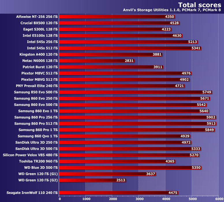 Как мы уже видели выше, рекордсменом в низкоуровневых тестах накопитель не является. Впрочем, в немалой степени это обусловлено его емкостью — все SSD этого уровня на четверть терабайта заметно медленнее, чем, например, на полтерабайта или больше (счастливым исключением является разве что 860 Evo, но для получения такого результата Samsung пришлось пойти на определенные ухищрения). Но в целом результаты сопоставимы с SanDisk Ultra 3D / WD Blue или... «старыми» накопителями на SandForce, но с «быстрой» MLC-памятью. Чего, на самом деле, на практике более чем достаточно.