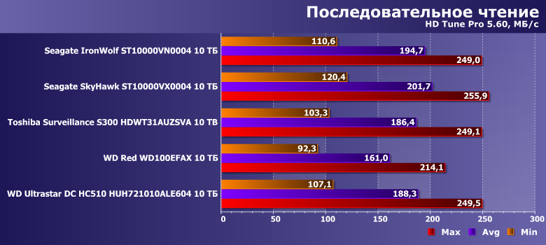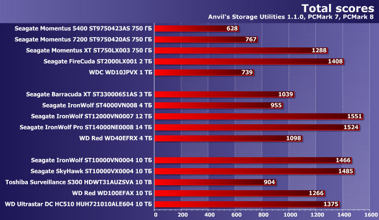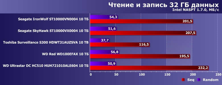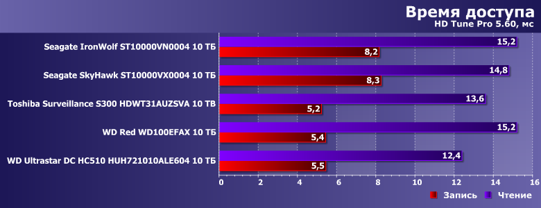Что интересно, и время доступа, измеренное «по-винчестерски» тоже начинает все меньше и меньше коррелировать как с результатами тестов высокого уровня, так и с ТТХ. Примеры? Пожалуйста — Seagate в обеих вариантах умудряется иногда даже проигрывать Red, имеющему более низкую скорость вращения пластин, хотя в остальных тестах, хоть как-то зависящих от задержек при доступе к данным (в том числе, и низкоуровневых), и IronWolf, и SkyHawk ведут себя не хуже прочих, а то и лучше. В принципе, это ничего существенно не меняет — просто является еще одним аргументом против попыток делать какие-то выводы о быстродействии на основании результатов того же HD Tune, не говоря уже о формальных ТТХ.