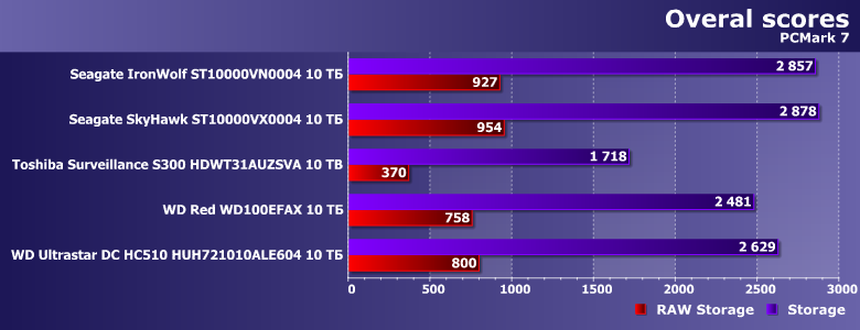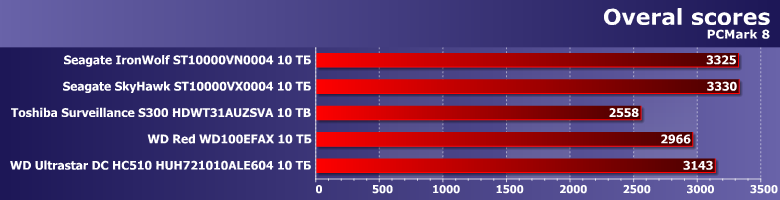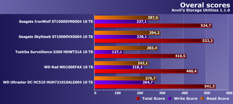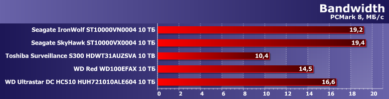 Как уже не раз было сказано, «системные» нагрузки несколько синтетичны для винчестеров высокой емкости: их покупатели могут себе позволить и SSD «приличного размера», куда поместятся и программы, и основные рабочие данные. С другой стороны, некоторые сценарии, моделируемые в PCMark, все равно применимы и к «дополнительному» накопителю: например, база фотографий или, тем более, медиатека с большой вероятностью будет храниться именно на винчестере при его наличии — некоторые именно для этих целей как раз и приобретают те же «десятки» и устанавливают их именно в ПК, а не в NAS. Кроме того, других «тяжелых» и комплексных нагрузок на типовом ПК обычно и вовсе не бывает, а низкоуровневые тесты работают с принципиально синтетическими — поэтому игнорировать данные тестовые пакеты не стоит. Собственно, никто этого и не делает — а не только мы :)