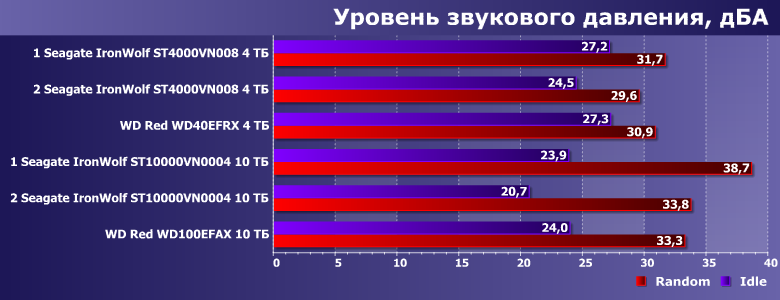 Сначала так и было — точнее, IronWolf шумели сильнее при работе, причем оба. Модель на 4 ТБ — лишь немногим, в паре «десяток» разница увеличилась. Казалось бы, так и должно быть — в первом случае 5900 об/мин против 5400 об/мин, а во втором уже пара 7200/5400. Только вот в покое (когда диски тоже вращаются, но головами двигать не надо) какой-то разницы не наблюдалось, т. е. фиксировали мы только шум механики. А спустя сутки непрерывных издевательств оба «волчары» (точнее, все четыре экземпляра, поскольку парами в режиме RAID1 мы каждую модель и тестировали) сбросили от 2 до 5 дБА, причем в покое тоже.