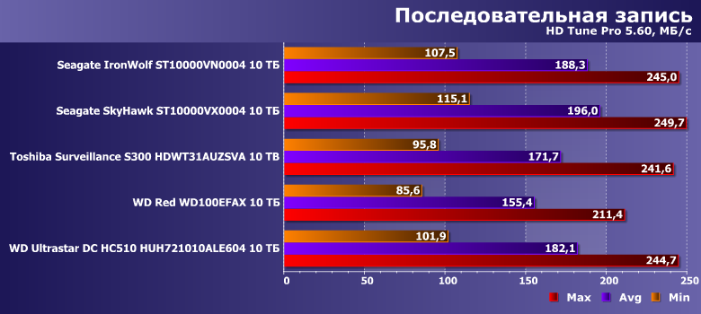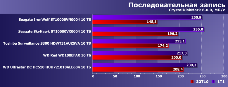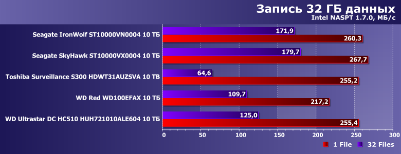 Запись данных еще интереснее. Чисто последовательный режим, впрочем, практически повторяет аналогичный сценарий при чтении данных — диски без использования технологии SMR так и должны себя вести. Многопоточный же режим при больших объемах записываемых данных «вырождается» в соревнование механики и алгоритмов «внутреннего» кэширования (влияние дисковых кэшей ОС отсутствует — в первую очередь как раз для этого мы и используем 32 ГБ). В итоге у обоих винчестеров Seagate производительность снижается в полтора раза, а у обеих моделей WD – в два. Для S300 же такие нагрузки просто противопоказаны.