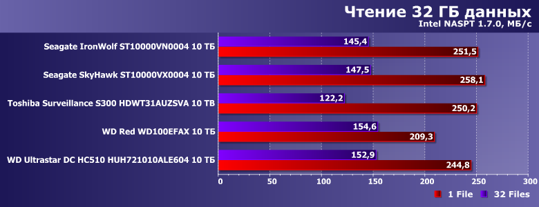 Что касается скорости в однопоточном режиме, то она очень хорошо коррелирует с результатами низкоуровневых тестов и (с учетом примерной одинаковости пластин) скоростью вращения пакета дисков. С заявленными же характеристиками все сложнее – напомним, что для всех IronWolf Seagate «обещает» лишь 210 МБ/с, что ниже как ожидаемого, так и демонстрируемого тестами (в кои веки эти вещи совпадают). 210 МБ/с на внешних дорожках при такой плотности записи должны демонстрировать винчестеры со скоростью вращения 5400 об/мин — и WD Red именно так себя и ведет. Словом, такой сценарий только подтверждает жизненный опыт и прочую «житейскую мудрость».