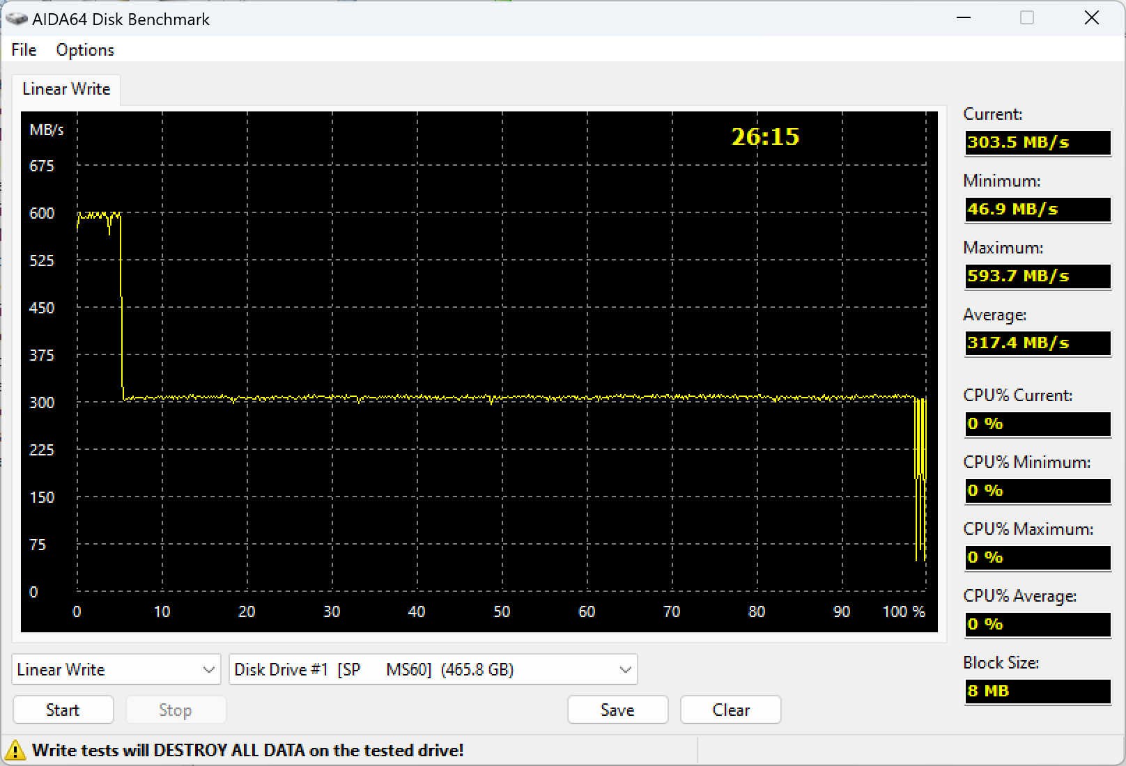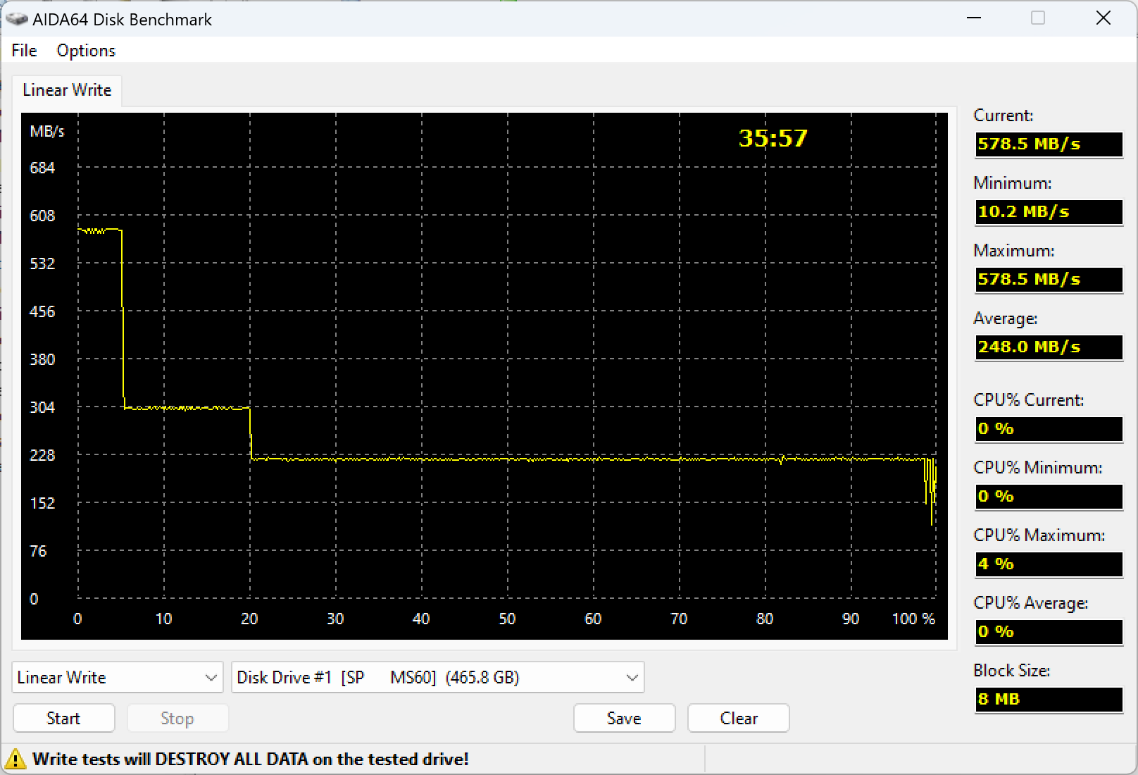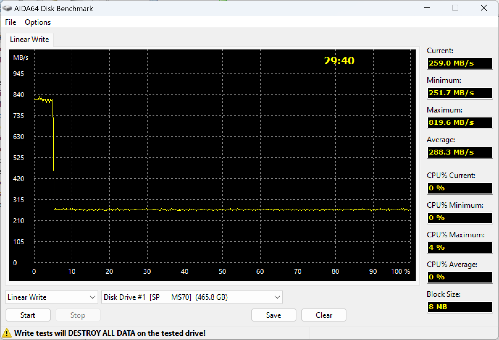 Для начала младший. Скорость записи в SLC-кэш ограничивает контроллер и делает это явно специально. Далее имеем практически стабильные 300 МБ/с, что для накопителя такой емкости совсем неплохо. Лишь в конце графика наблюдаются заметные провалы скорости, что можно объяснить не только усложнением работы из-за разгребания кэша, но и банальным перегревом (к сожалению, мониторинг температуры одновременно с тестами AIDA64 имеет свои сложности). Но в целом для сегодняшнего состояния дел на рынке результаты мы склонны считать очень хорошими.