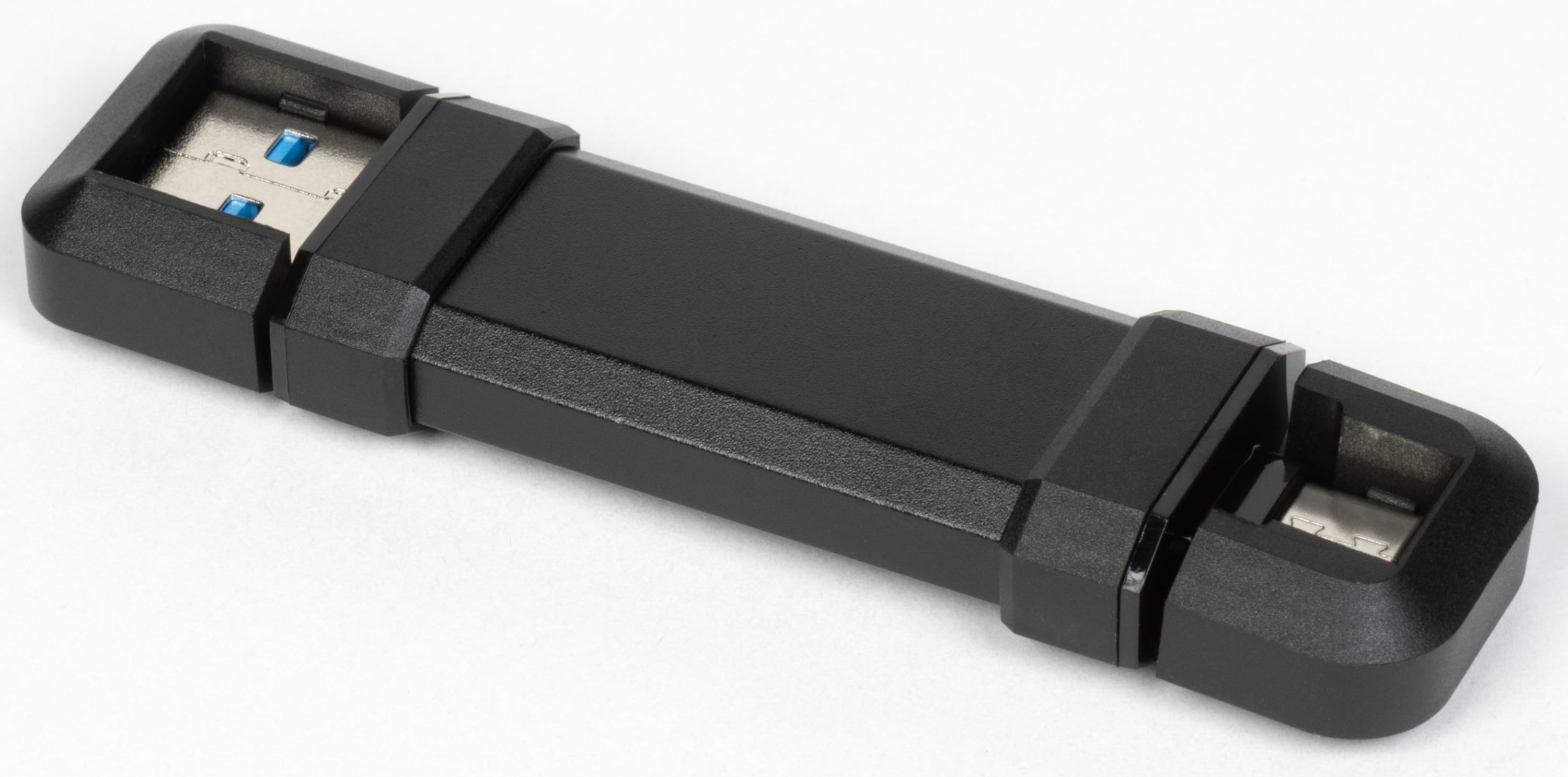 Напомним, что размеры PX10 составляют 103×33×10 мм при массе чуть больше 30 г, да еще и дополнительный кабель носить нужно. DS72 прекрасно обходится без такового — поскольку снабжен USB-вилками обоих актуальных на сегодня типов. И сам заметно меньше: лишь 81×21×10 мм при массе 15,6 г по паспорту (15,4 г согласно нашим весам). То есть внешне — просто флэшка. Не самая компактная, но встречались мы и с намного более габаритными.