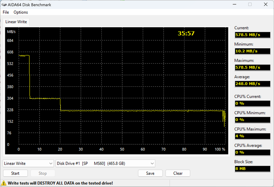 Иллюстрация того, что мы говорили выше — всё познается в сравнении. Transcend ESD310 тратит на запись той же половинки терабайта в два-три раза больше времени. Просто потому, что под кэш отводит все свободные ячейки, а дальше ему приходится долго и муторно кэш «упаковывать», продолжая принимать новые данные. Да еще и память довольно медленная — чтоб жизнь малиной не казалась. Какие 200 МБ/с — тут и стабильных 100 уже не получается.