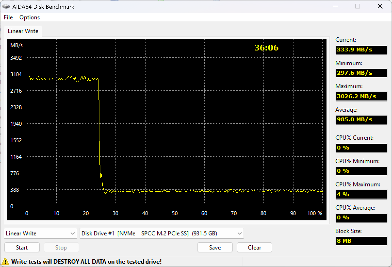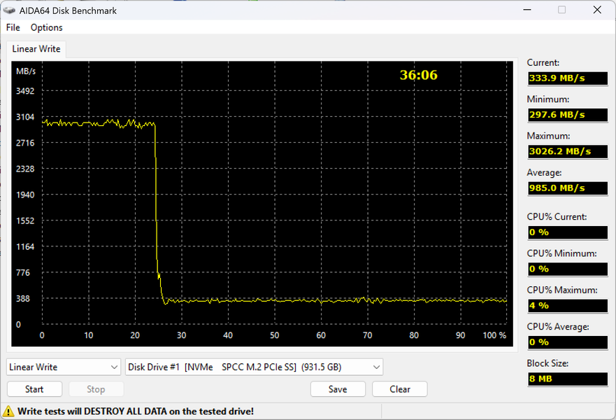 До заявленных 4800 МБ/с далеко и в пределах SLC-кэша, но это можно списать на особенности работы разных программ — максимум декларируется для какого-нибудь CrystalDiskMark в многопоточном режиме, что с алгоритмами работы AIDA64 перекликается примерно никак. Сам же график характерен для бюджетных контроллеров, пишущих данные только через кэш. Последний в таком случае имеет делать максимально большим, а что там при этом происходит за его пределами... производители никак не оговаривают, во-первых. Покупатели, эксплуатирующие такой накопитель в гордом одиночестве в недорогом компьютере в кэш обычно «попадать» будут, так что и никаких проблем не заметят. Тем более, что у этой платформы скорость записи и вне SLC-кэша не слишком высокая, но вполне приемлемая: три-четыре сотни мегабайт в секунду, конечно, уложились бы и в ограничения SATA, но это, опять же, для дня сегодняшнего обыденность. Точнее, лучше обыденности, но об этом чуть позже.