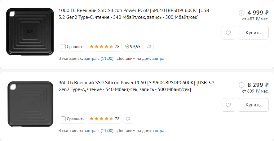 А массовость как обычно в первую очередь набирается бюджетной продукцией. Однако за последние годы само понятие бюджетности несколько изменилось. Например, в самый разгар пандемии почти три года назад мы тестировали внешний SSD Silicon Power PC60 емкостью 960 ГБ, а стоил он десять тысяч рублей — что на тот момент было более чем приемлемо за терабайтник (более серьезные модели продавались в полтора-два раза дороже), но стоило в пару раз дороже, чем внешний жесткий диск на 2 ТБ. С тех пор стоимость вторых практически не изменилась, а вот с первым случилась интересная история.