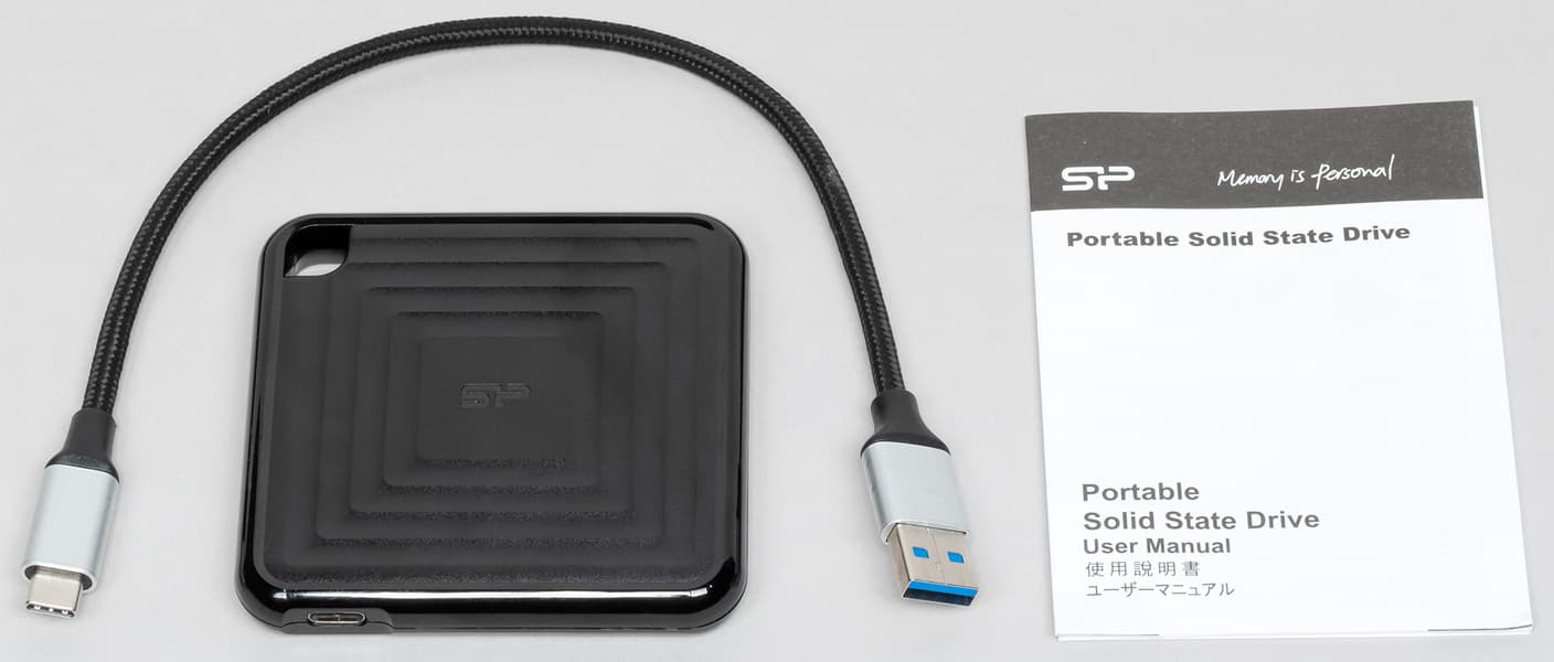 Комплект поставки — минималистический: короткая инструкция (сводящаяся к тому, что для использования нужно воткнуть кабель в компьютер) и всего один интерфейсный USB-кабель с разъемами А и С. С учетом того, что кабели на фоне цены устройства стоят копейки, такая экономия выглядит уже странной даже в бюджетном сегменте. Впрочем, справедливости ради, пока еще С—С необходимы лишь немногим пользователям компьютеров, а желающие подключить внешний накопитель к смартфону эту «проблему» решать умеют.