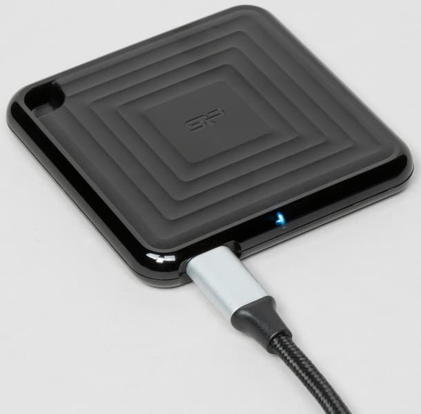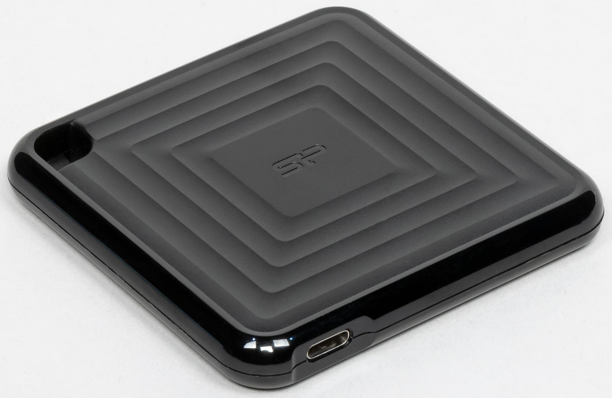 Перед нами пластиковый корпус, размерами 80×80×11,2 мм — больше самых компактных моделей на mSATA или M.2 внутри, но заметно меньше внешних жестких дисков. Последние сами по себе сильно ограничивают полет фантазии дизайнеров, а вот SSD могут быть разными. Необязательно даже использовать миниатюрные карты: в большинстве внутренних SATA SSD формата 2,5″ 7 мм плата меньше корпуса. На нее можно просто добавить мост USB—SATA и поменять разъем — сразу получится новый компактный продукт. А можно «играть» и с модульностью. В итоге внешние SSD на полках получаются разными — что выигрышно смотрится на фоне однообразия флэшек, или, тем более, винчестеров — которые всегда больше и тяжелее. В Silicon Power же хорошо поработали над весом — это как бы не первый попавшийся нам терабайтник (независимо от технического исполнения), уложившийся в 45 г. Так что где-нибудь в женской сумочке или кармане обузой не будет.