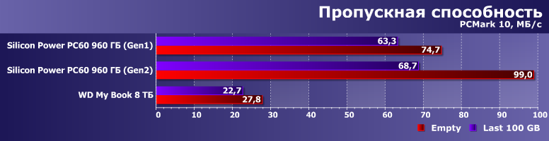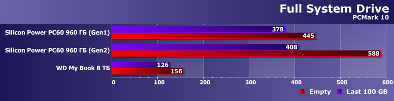 В общем, отдельный материал, посвященный PCMark 10 Storage, у нас будет. Вводить программу в рабочий цикл мы тоже будем — очень интересна в качестве комплексной оценки потребительских характеристик. Пока же стадия тестирования самого пакета — который мы применили и в этом случае. Правда сравнивать испытуемого почти не с кем — на других внешних SSD мы эти тесты не гоняли. Зато недавно воспользовались ими при тестировании стационарного внешнего винчестера WD My Book емкостью 8 ТБ, так что сегодня возьмем оттуда результаты для файловой системы NTFS в начале и конце диска (производительность у винчестеров в этих областях меняется немного по другим причинам, нежели у SSD — но тоже разная). И сравним с PC60 — также пустым и заполненным, причем подключаемым как к USB3 Gen1, так и Gen2, что дает нам четыре набора значений.