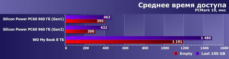 И в разы отличается время доступа — которое как раз и является самым слабым местом «механики», не позволяя достигать в реальных условиях такой же скорости передачи данных, какая получается в чисто последовательных операциях. Также стоит обратить внимание и на то, что интерфейс имеет значение — даже будучи забитым данными PC60 «откликается» резвее при подключении к порту Gen2, нежели пустым на Gen1. Тоже, в общем-то важный результат — прямо показывающий, что ускорение внешних интерфейсов нужно не только для получения высокой пиковой пропускной способности: новые стандарты быстрее и на практике. В том числе, и в неудобных условиях.
