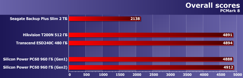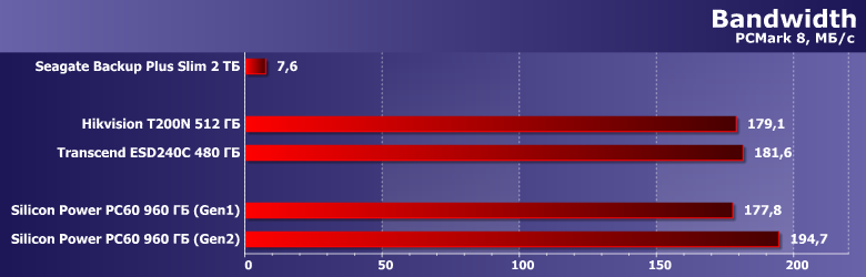 Для пущей объективности мы протестировали Silicon Power PC60 в двух режимах — подключенным к портам USB3 Gen1 и Gen2. А для большей наглядности — добавили еще результаты типичного внешнего жесткого диска на 2 ТБ.