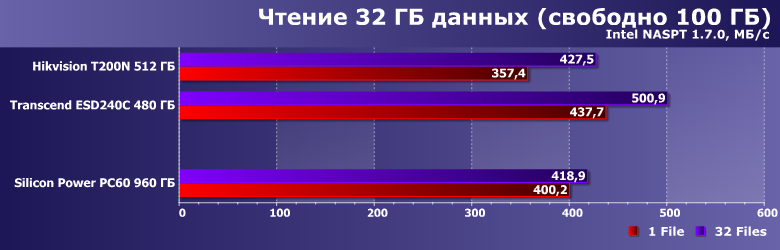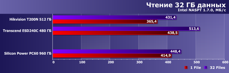 Аналогично предыдущему случаю — только еще ярче выражено. И, если вспомнить результаты других протестированных накопителей, то можно прийти к выводу, что даже разница в типах памяти иногда не так страшна, как прочие особенности конфигурации — например, Intel SSD 660p 512 ГБ «переделанным» во внешнее исполнение с подобными сценариями справлялся быстрее. Несмотря на QLC-память — а не TLC, как в данном случае. С другой стороны, жесткие диски не быстрее. Да и кроме таких «неудобных» случаев в жизни внешних SSD встречается много куда более удобных. Почему на такое поведение бюджетных моделей можно и не обращать внимание. Но забывать о нем тоже не стоит.