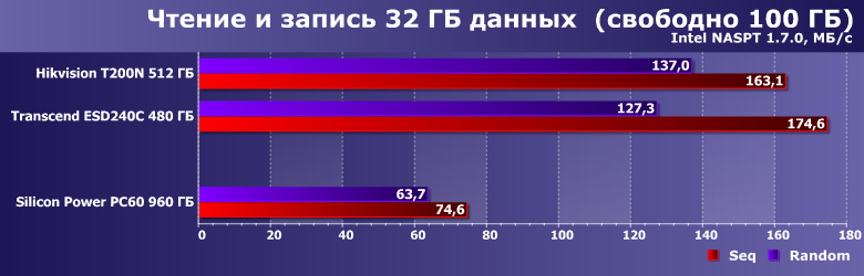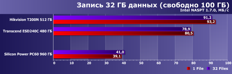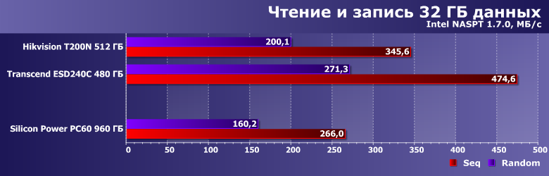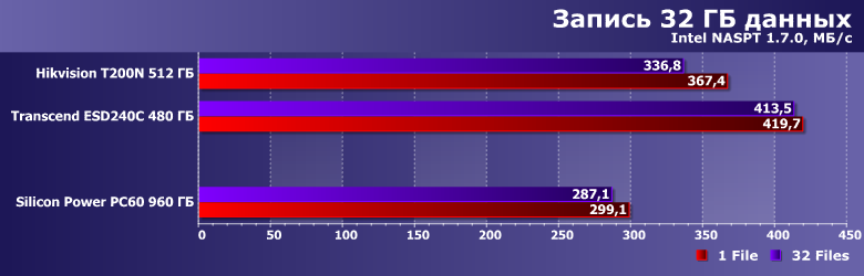 Возьми мы все накопители одной емкости, причем минимальной (240 ГБ) — работали бы они одинаково. Но модели Transcend и Hikvision неплохо масштабируют производительность с увеличением емкости — а Silicon Power PC60 так не может. Поэтому и оказывается самым медленным. Опять же — среди подобных SSD, а не в целом на рынке накопителей.