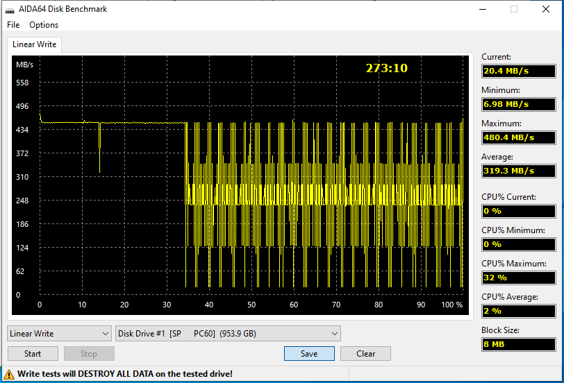 Треть пустого накопителя «прописывается» в однобитном режиме. Дальше график начинает метаться, как стрелка осциллографа ©. В общей сложности — более четырех с половиной часов на неполный терабайт, т. е. средняя скорость заполнения данными составляет 58,6 МБ/с. Для моделей такой емкости — маловато, конечно. Но это во многом проблема масштабирования — из-за двухканального режима работы, производительность вместе с емкостью не увеличивается, так что самыми интересными, пожалуй, можно считать младшие модификации на 240 и 480 ГБ (они же еще и самые дешевые), а вот от одного-двух терабайт ожидается нечто большее. Но мы предупреждали. Высокую скорость записи по всему объему получить можно, а за сопоставимые деньги — только если «поработать» самостоятельно. При наличии же достаточного количества свободного места кэширование со своей работой справляться будет эффективно — главное, чтобы место было. Ниже мы рассмотрим обе ситуации более подробно.