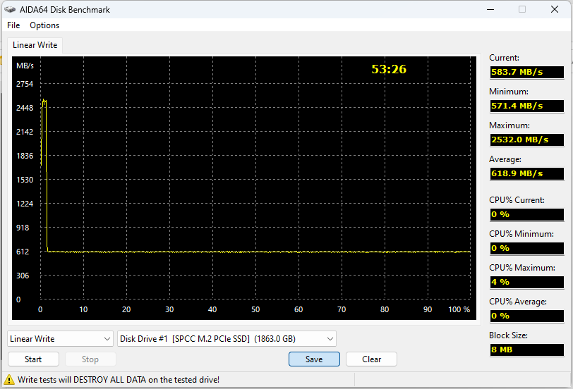 Мы не ожидали от устройства никакого подвоха, благо платформа старая, но сюрпризы обнаружились. Большинство производителей в SSD на E19T используют динамическое SLC-кэширование, что является палкой о двух концах. С одной стороны, при запасе свободного места позволяет на высокой скорости записывать больше данных, что увеличивает производительность. Особенно верно это для «системного» диска, где записывать реально большие объемы данных никогда или почти никогда не приходится. Но такой подход сильно снижает скорость записи вне кэша и приводит к нестабильности результатов и их зависимости от количества свободного места. А Silicon Power предпочел ограничиться только статическим SLC-кэшом небольшого размера. Много данных в этом случае быстро не запишешь, зато и совсем низкой скорость записи не будет никогда. Бюджетная платформа, но, во всяком случае, SATA так не умеет — ниже 600 МБ/с не падаем. Причем слишком быстро Phison E19T и в кэш писать не умеет (поэтому отдельное тестирование в режиме PCIe Gen3 просто не требуется — график будет таким же), так что незачем его увеличивать. И для дополнительного накопителя такой подход, пожалуй, более правильный.