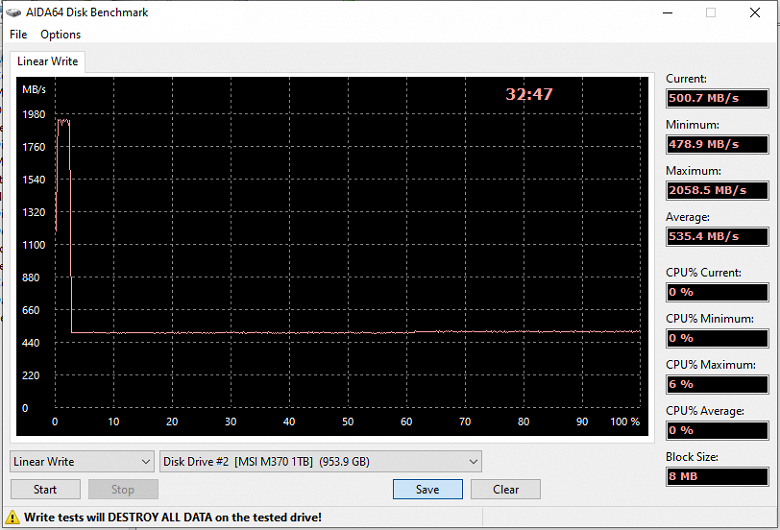 У SSD на Phison E13T отсутствие динамического кэширование встречалось достаточно часто. В MSI Spatium M370 как раз так. Что хорошо — сравнение будет максимально корректным. И оно не в пользу E13T — в пределах кэша мы не достигаем и 2 ГБ/с, а за его пределами прямая запись на скорости 500 МБ/с. Несущественно меньше, чем 600 МБ/с, но этот уровень для SATA-накопителей достижим, а вот 600 — нет.