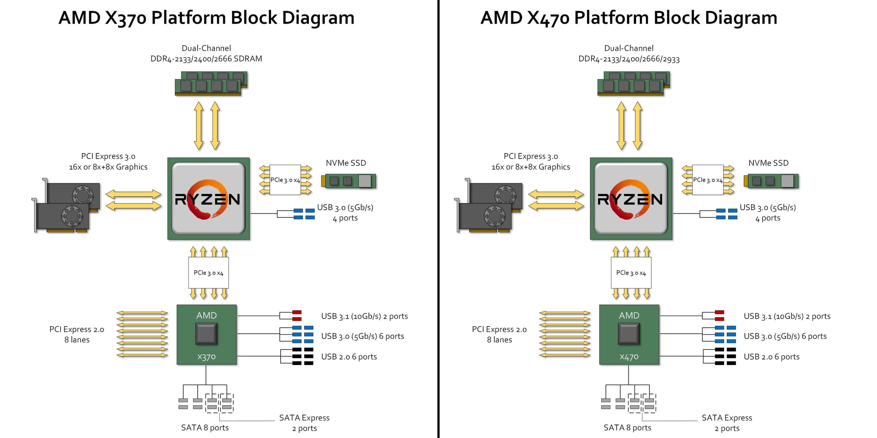 Однако AMD это не слишком расстроило, поскольку первые Zen делались во многом с оглядкой на серверный рынок — или на HEDT. К 2017 году необходимость увеличения количества собственно «процессорных» интерфейсов была очевидна, так что первые же восьмиядерные кристаллы получили по 32 линии PCIe 3.0. Полностью они использовались только в Epyc и Ryzen Threadripper, а в AM4 приходилось ограничиваться 24-мя — но и это на четыре линии больше, чем в процессорах под все версии LGA1151. И эти «лишние» четыре линии как раз и использовались для подключения «первичного» SSD прямо к процессору. Одного — со вторым уже возникали серьезные проблемы. Но большинству покупателей одного было и достаточно. В APU количество линий было меньшим — но «выделенный» интерфейс для SSD пришлось сохранить для совместимости.