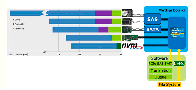 Однако раз уж священную корову совместимости стало возможным отправить под нож и применительно к аппаратной совместимости, отпала необходимость в сохранении программной. Все накопители до середины «десятых» использовали программный протокол AHCI — разработанный в общем-то для тихоходных последовательных устройств. Включая и жесткие диски — где произвольная адресация возможна, но время доступа к сектору со «случайным» адресом радикально превышает время его чтения или записи. Т. е. нормальная быстрая работа возможна только если мы работаем с данными последовательно — вот в этом случае и получаются пиковые десятки мегабайт в секунду (до 250 МБ/с на внешних дорожках современных моделей). Но любое отступление от этой модели приводит к единицам мегабайт или даже их долям — большая часть времени уходит на поиск нужных секторов. Средние задержки при выполнении команд «механикой» составляли и составляют порядка 2 мс, а использование флэш-памяти позволяет сократить это время примерно в 20 раз — до 100 мкс. Естественно, это видно невооруженным глазом — почему SSD и пошли в массы. А в ряде сфер применения задержки нужно было сокращать и дальше — чего устаревшие методы работы с данными не позволяли. Тем более бессмысленным было применение старых протоколов к памяти с еще более низкими задержками, чем флэш, которая тоже начала появляться (хотя бы в лабораториях).