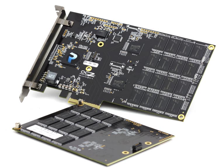 Поэтому менее, чем через год на рынок были выпущены RevoDrive3 и RevoDrive3 X2. Главным усовершенствованием новой модели была замена связки из Sil3124 с мостом на новый SAS-контроллер SuperScale OCZ ICT-0183, изначально поддерживающий PCIe 2.0. Соответственно, те же четыре линии уже обеспечивают пропускную способность в 2 ГБ/с (на практике — скорее 1,6 ГБ/с), т. е. вдвое больше, чем раньше. Ну а для того, чтобы полностью задействовать открывшиеся перспективы, на смену двум/четырем контроллерам SF-1222 пришли два или четыре же SF-2281 с поддержкой интерфейса SATA600. По сути, тот же RAID0, хотя об этом компания предпочитала не упоминать, упирая на использование собственной архитектуры массива, основанной на запатентованном алгоритме балансирования очереди запросов. Но в общем и целом — все тоже четырехкратное чередование на верхнем уровне, умноженное на чередование каналов флэш-памяти после контроллеров, что и обеспечивает высокую производительность. Правда... Не совсем понятно было — зачем? С ноутбуками и прочими компактными ПК эти решения были принципиально несовместимы, а в десктопах или серверах подобный массив из нескольких SSD можно было собрать и самостоятельно.