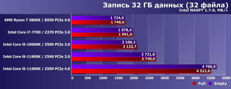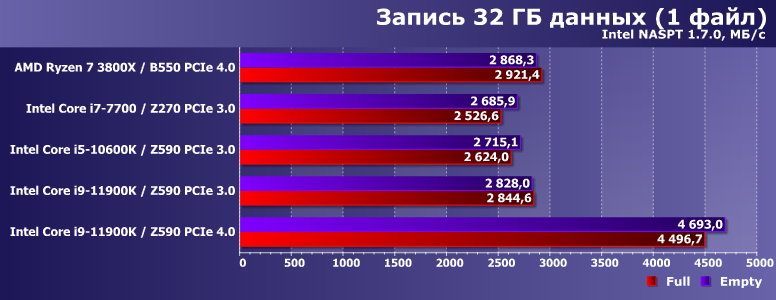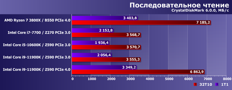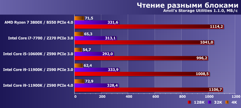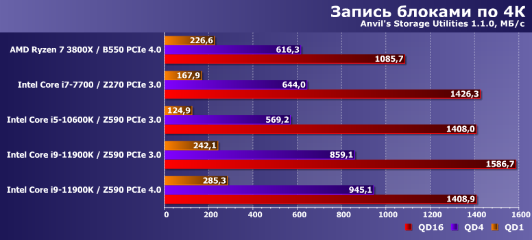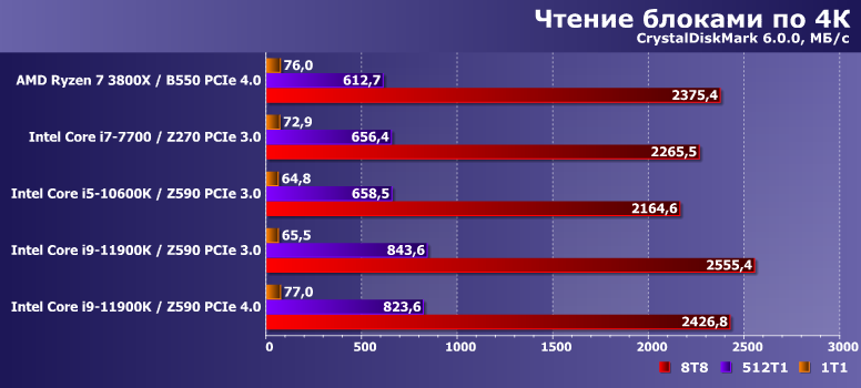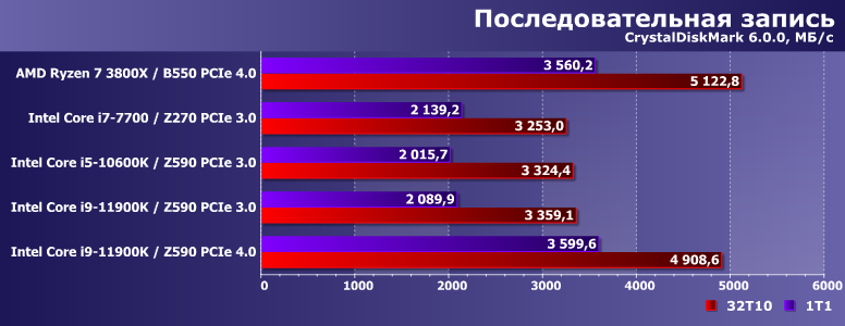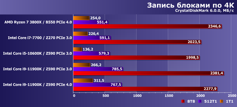 Многопоточная же запись на АМ4 стабильно замедлялась не только по сравнению с однопоточной там же, но и оказывалась медленнее, чем на любых платформах Intel. Оказывается, что это вовсе не обязательно — Core i9-11900K заставляет выкладываться на полную и сам SSD, и используемый интерфейс. Так что и тут проявилась «полезность» PCIe 4.0. Но только в этом случае.