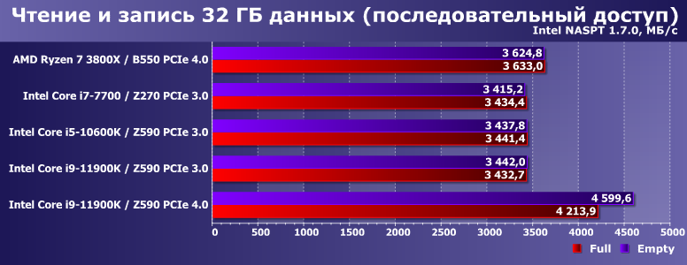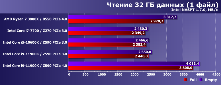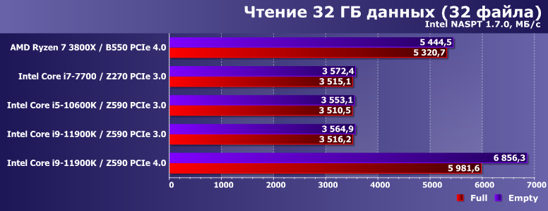 Особенно если говорить о многопоточном режиме, способном «забить» всю полосу пропускания. Именно такое давно происходит с топовыми SSD на PCIe 3.0 — с любыми и на всех платформах. Но почему-то долгое время не получалось на АМ4 с PCIe 4.0. На Rocket Lake — получилось сразу. Практически в полном соответствии с результатами низкоуровневых утилит — пока идет чтение данных, оставшихся в SLC-кэше. В процессе заполнения SSD данными мы их оттуда гарантированно вытесняем — и получаем уже «честную» скорость самого TLC-массива (то, что очень важно — но другими средствами очень сложно измерить). Разница, как видим, велика. А на АМ4 — нет, поскольку там и абсолютные результаты еще ниже.