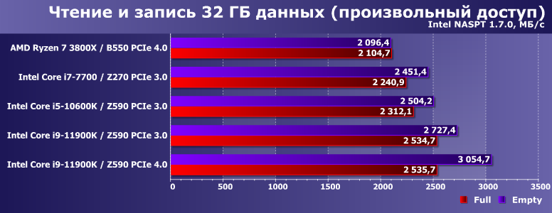 И он же есть даже при произвольном доступе — который на АМ4 был и вовсе слабым местом. Впрочем, тут и хорошо заметно, что на результаты большое влияние оказывает не только пропускная способность интерфейса. Или, даже, не столько она — Core i9-11900K оказывается на лидирующих позициях даже при использовании «чипсетного» подключения. Кстати, как и при «просто» многопоточной записи — но там интерфейс имел заметно большее значение.