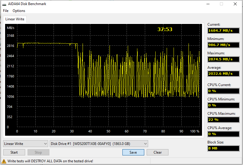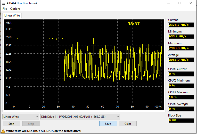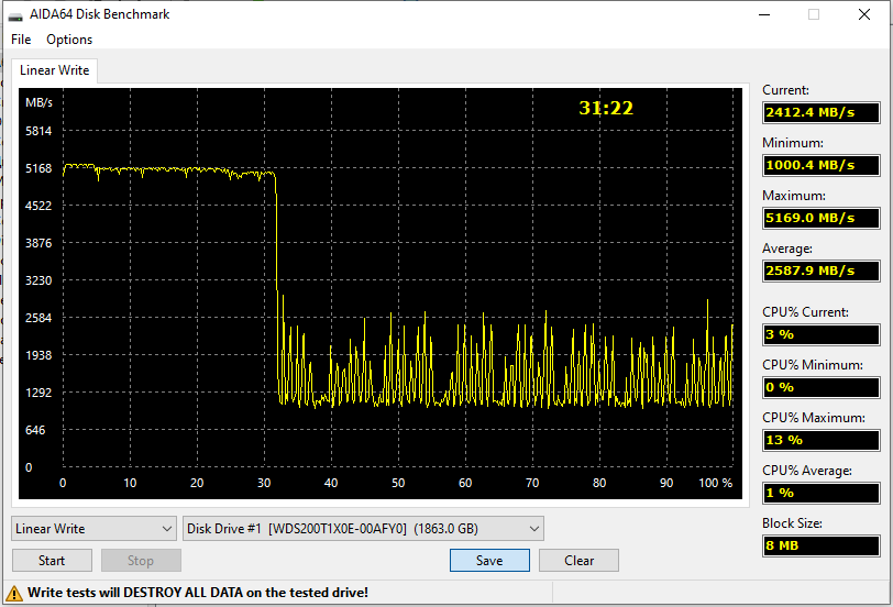 Правда вот идиллия мгновенно кончается, как только мы касаемся последовательной же, но записи. Black SN850 — один из самых быстрых SSD, способный выбраться за ограничения PCIe 3.0 и в этом случае (по крайней мере, в пределах SLC-кэша — а больше ничего низкоуровневые утилиты померить давно уже и не могут). Но об удвоении пиковых показателей хотя бы в подобном синтетическом случае речи уже не идет.