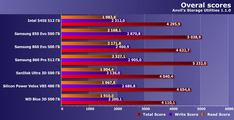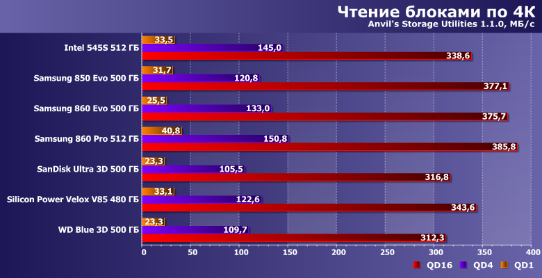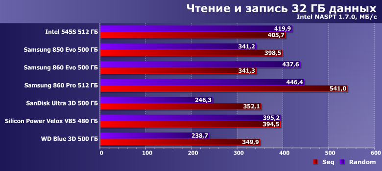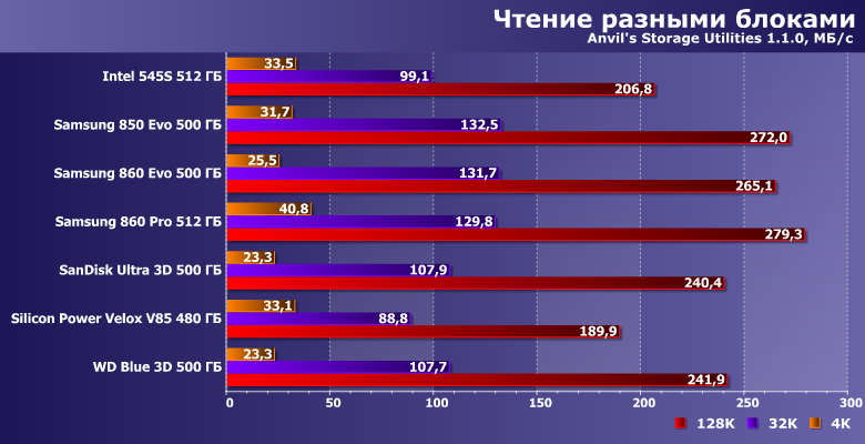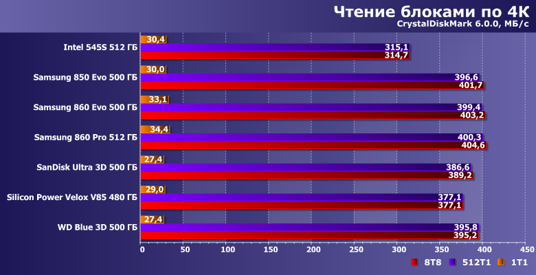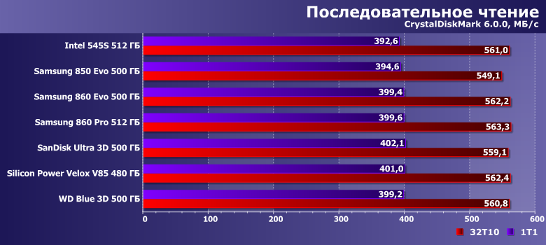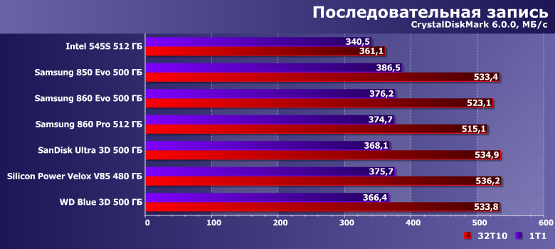 | Intel 545s 512 ГБ | Samsung 850 Evo 500 ГБ | Samsung 860 Evo 500 ГБ | Samsung 860 Pro 512 ГБ | SanDisk Ultra 3D 500 ГБ | Silicon Power Velox V85 480 ГБ | WD Blue 3D 500 ГБ |