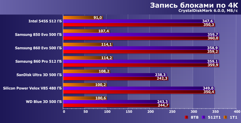 При записи же подобным образом может вести себя лишь пара накопителей Samsung — 850 Evo и 860 Pro. А вот 860 Evo из-за перехода на кристаллы по 512 Гбит вообще оказался аутсайдером.