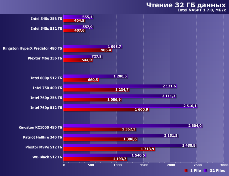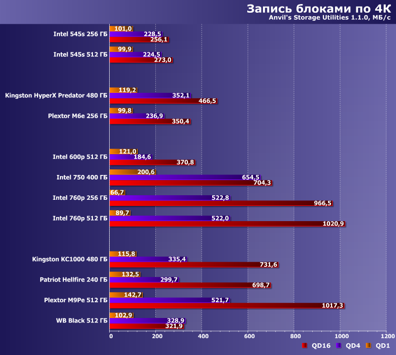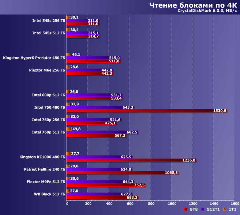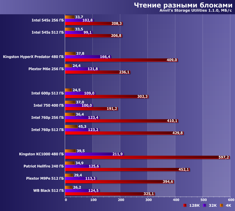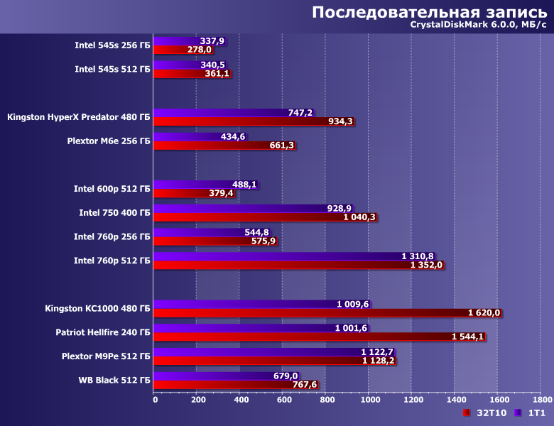 | Intel 545s 512 ГБ | Intel 600p 512 ГБ | Intel 750 400 ГБ | Intel 760p 512 ГБ | Kingston HyperX Predator 480 ГБ | Kingston KC1000 480 ГБ | Plextor M9PeG 512 ГБ | WD Black 512 ГБ |