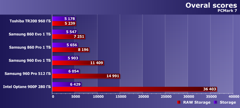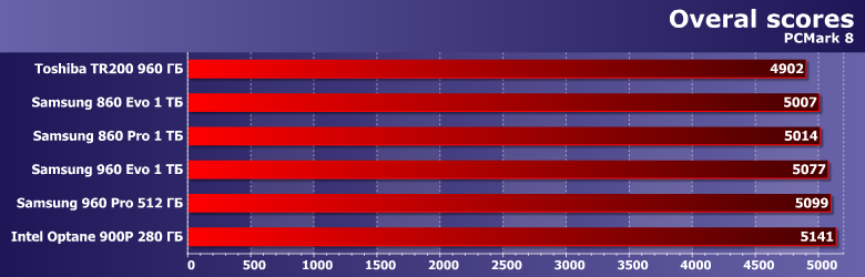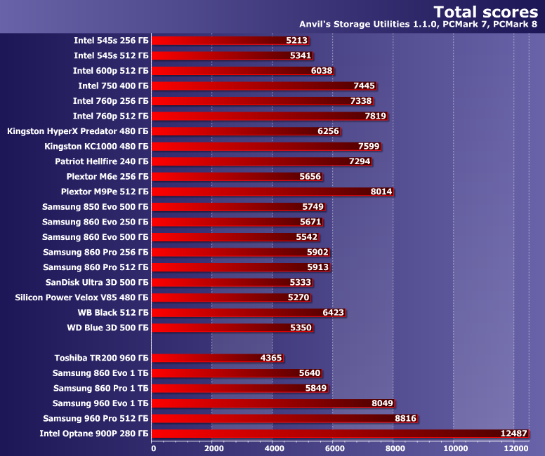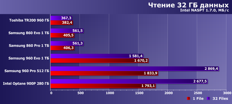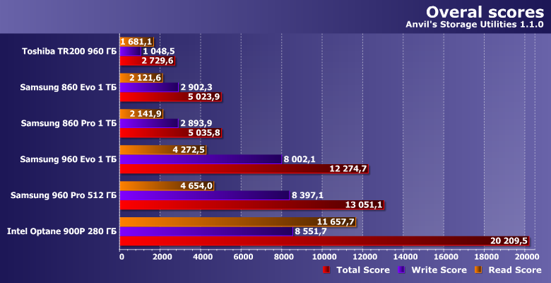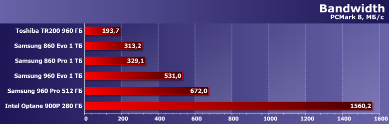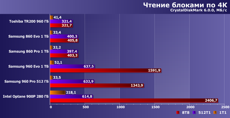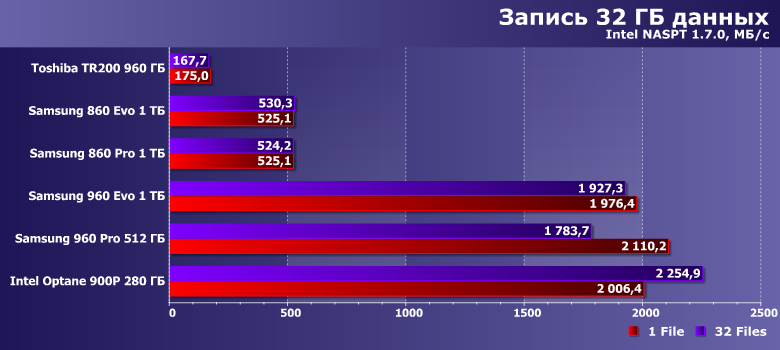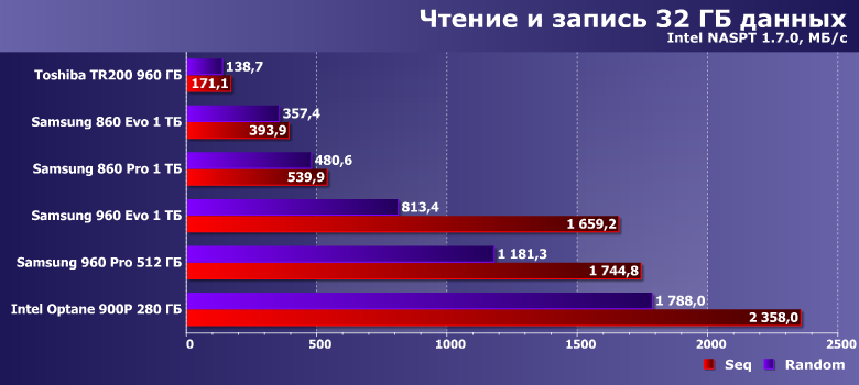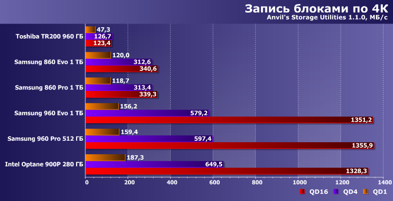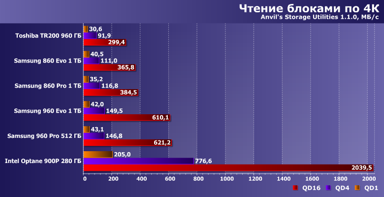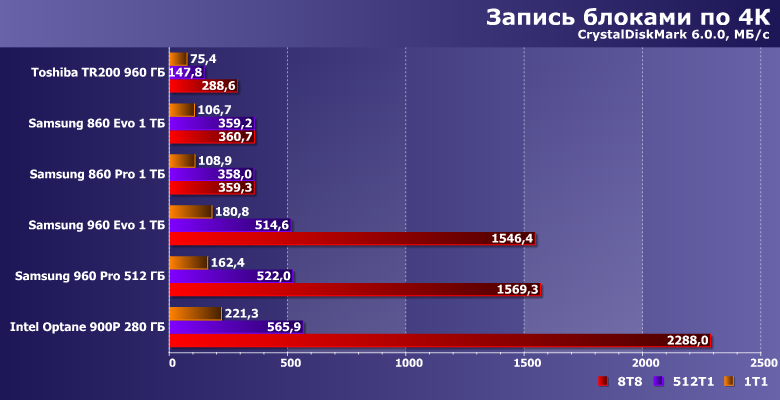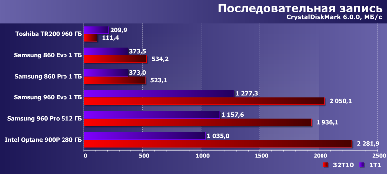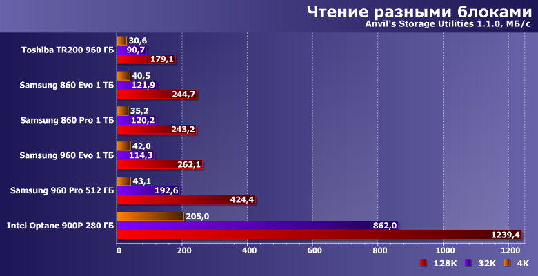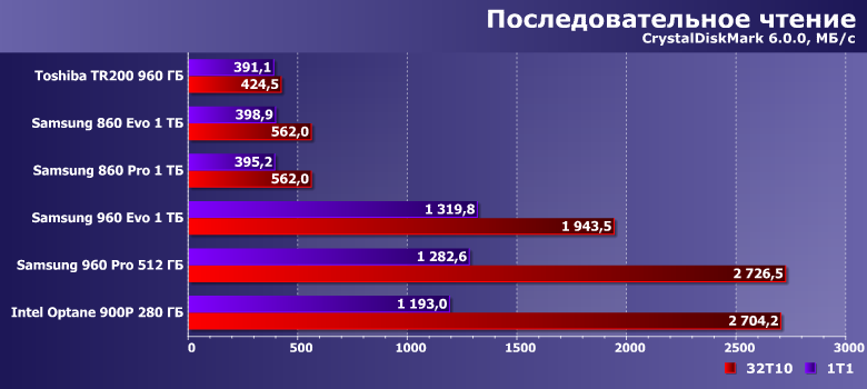 | Samsung 860 Evo 1 ТБ | Toshiba TR200 960 ГБ | Samsung 860 Pro 1 ТБ | Samsung 960 Evo 1 ТБ | Samsung 960 Pro 512 ГБ | Intel Optane SSD 900P 280 ГБ |