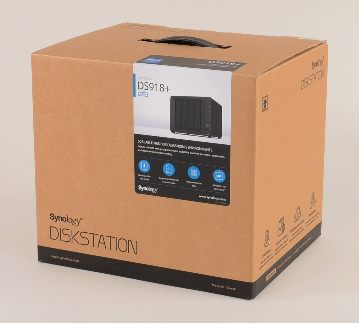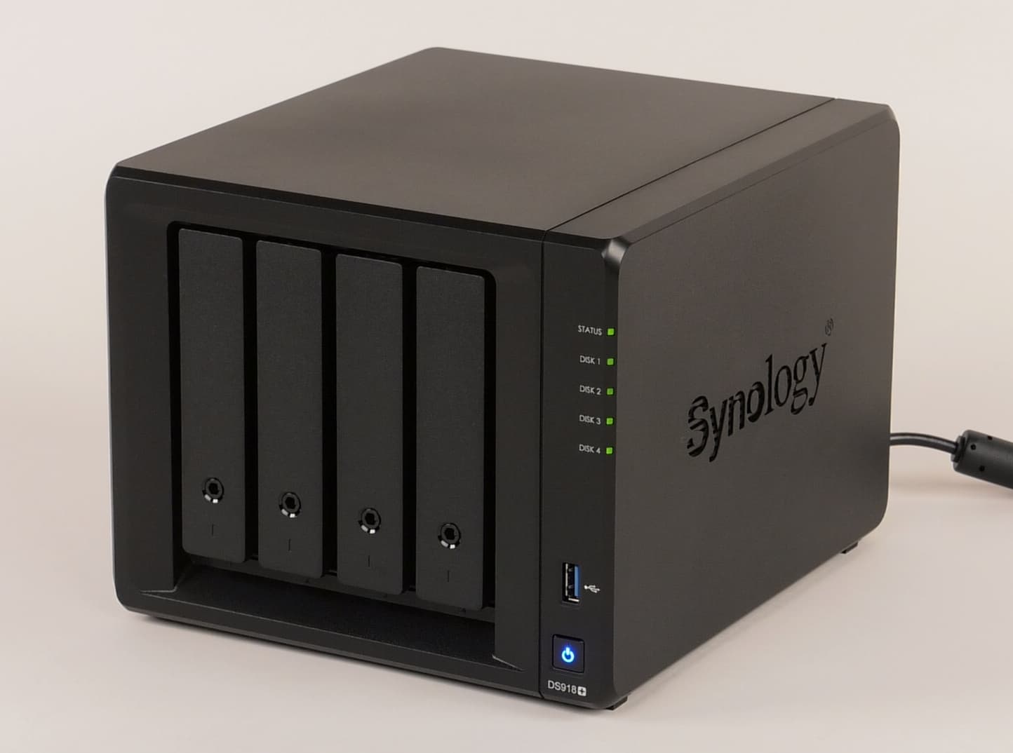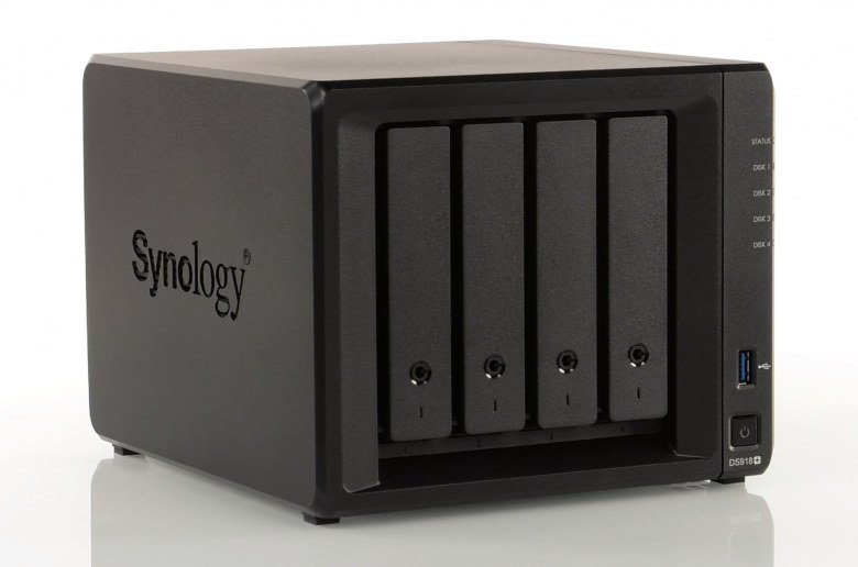 Компания Synology уже несколько лет уверенно лидирует в категории «Сетевые накопители» нашего опроса «iXBT Brand — Выбор читателей». Одной из причин этого является регулярное обновление линеек продуктов, а также постоянное расширение возможностей их программного обеспечения. Осенью прошлого года компания представила несколько устройств 2018-го модельного года, выполненных в настольном формате. Наиболее мощной из новинок является DS918+. Это устройство имеет четыре дисковых отсека и порт eSATA для подключения дополнительного внешнего модуля расширения на пять винчестеров. С учетом поддержки дисков объемом до 12 ТБ включительно, общая емкость хранения может достигать 108 ТБ.
