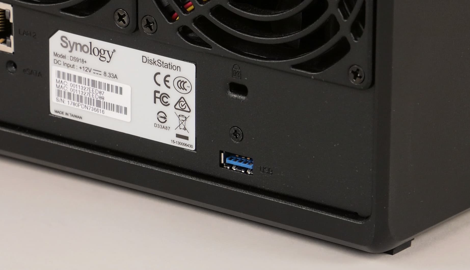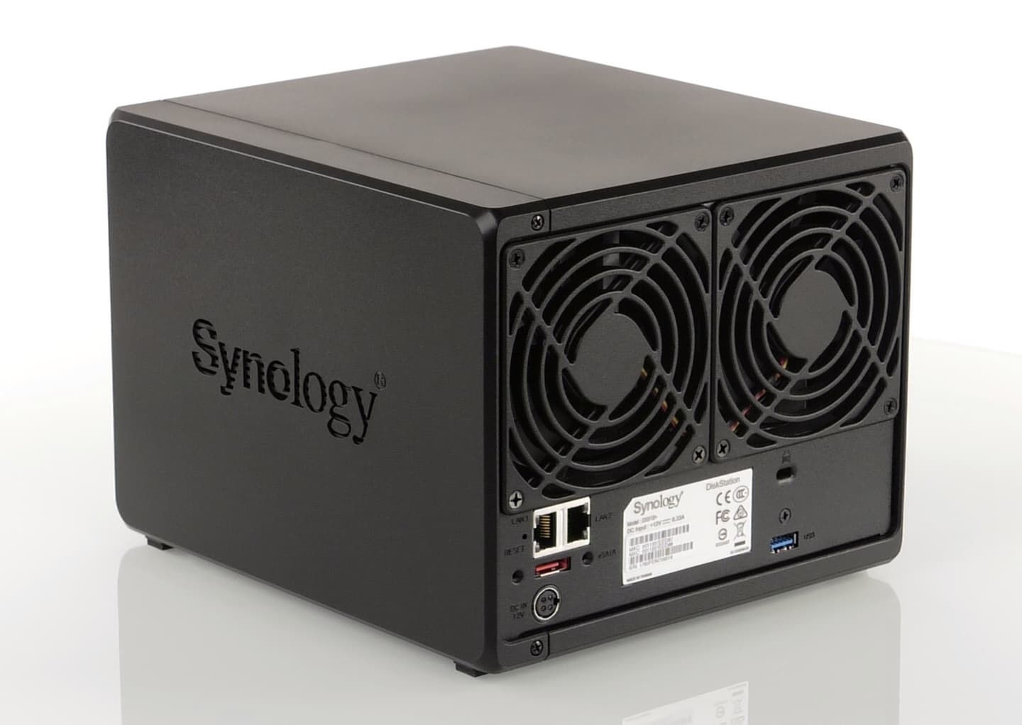 Для охлаждения дисков и процессора используются два вентилятора 92 мм. Они имеют трехпроводное подключение, позволяющее контролировать работоспособность, а также программную регулировку скорости вращения. По уровню шума устройство, как это обычно бывает у Synology, получилось очень тихим, оно не доставит неудобства не только в рабочей офисной обстановке, но и дома.