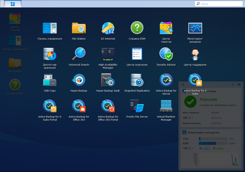 Про интерфейс и возможности программного обеспечения DSM мы писали уже не раз. Этот продукт является сегодня одним из наиболее удобных и функциональных. Он позволяет не только выполнять базовые функции хранения данных и доступа к ним с контролем прав пользователей и групп по сети и через интернет с различных устройств, включая компьютеры с Windows, macOS и Linux, а также мобильные гаджеты, медиаплееры и телевизоры, но и десятки других задач.