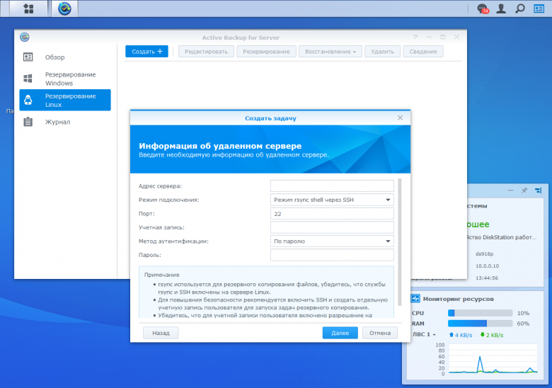 Для таких ситуаций компания предлагает модуль Active Backup for Server. Он позволяет создавать задания резервного копирования данных с серверов в локальной сети на самом сетевом накопителе — с Windows по SMB (поддерживается также Windows VSS) и с Linux по rsync или SSH. Решение поддерживает несколько режимов, работу по расписанию, установку фильтров на типы файлов и другие опции.