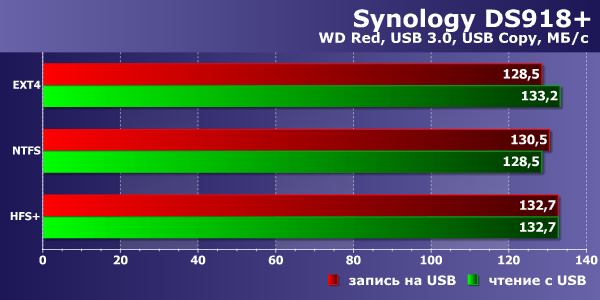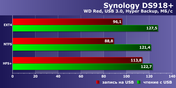 Несмотря на то, что модель поддерживает диски на 12 ТБ и имеет четыре отсека, скорость работы с внешними накопителями с интерфейсом USB 3.0 имеет важное значение. Эти устройства можно использовать как для расширения объема хранения данных, так и для создания дополнительных копий с основных томов. Для проверки этого сценария применялся точно такой же винчестер WD Red объемом 2 ТБ, который подключался через адаптер SATA—USB 3.0. При этом проверялись три файловые системы — ext4, NTFS и HFS+. Конфигурация внутреннего тома в этом тесте — RAID5 с BTRFS. Для оценки скорости применялись штатные модули USB Copy и Hyper Backup. Исходные данные представляли собой папку с одним файлом объемом 32 ГБ.