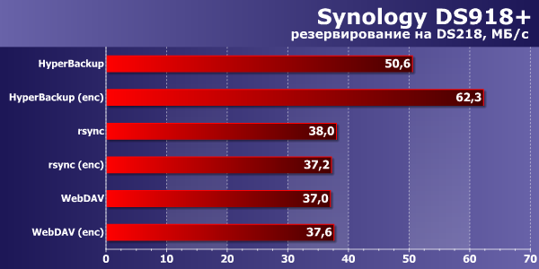 Во время проведения тестирования у нас был доступ к еще одной новинке Synology — DS218+. Так что мы решили проверить сценарий резервного копирования по сети с одного устройства на другое. Модуль Hyper Backup поддерживает в качестве мест назначения другие сетевые накопители Synology, сервера rsync и WebDAV (не считая многочисленных облачных сервисов). Мы проверили все три варианта. Причем дополнительно можно использовать и шифрование передаваемых данных, в частности SSH для rsync и HTTPS для WebDAV. Итого получилось шесть вариантов.